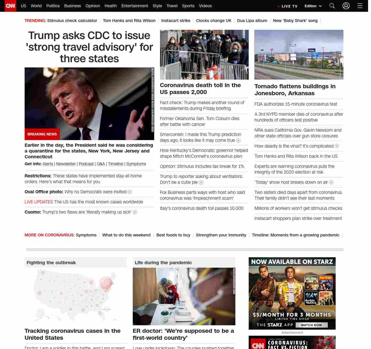 || screaming-banner-text banner-text-size–char-47″ data-analytics=”_list-hierarchical-xs_article_”> Trump asks CDC to issue ‘strong travel advisory’ for three states ||” , title: “CNN – Breaking News, Latest News and Videos” , siblings: {“articleList”:[{“uri”:”/2020/03/28/politics/trump-new-york-new-jersey-quarantine-coronavirus/index.html”,”headline”:”u003cstrong>Earlier in the day, the President said he was considering a quarantine for the states, New York, New Jersey and Connecticutu003c/strong>”,”thumbnail”:”//cdn.cnn.com/cnnnext/dam/assets/200328091200-01-trump-coronavirus-press-briefing-0327-small-11.jpg”,”duration”:””,”description”:”u003cstrong>Get info:u003c/strong> u003ca href=”https://www.cnn.com/specials/mobile-apps” target=”_blank”>Alertsu003c/a> | u003ca href=”https://www.cnn.com/specials/coronavirus-newsletter?utm_source=hp&source=hp” target=”_blank”>Newsletteru003c/a> | u003ca href=”https://www.cnn.com/audio/podcasts/corona-virus”>Podcastu003c/a> | u003ca href=”https://www.cnn.com/interactive/2020/health/coronavirus-questions-answers/” target=”_blank”>Q&Au003c/a> | u003ca href=”https://www.cnn.com/2020/02/06/health/wuhan-coronavirus-timeline-fast-facts/index.html” target=”_blank”>Timelineu003c/a> | u003ca href=”https://www.cnn.com/2020/03/28/health/coronavirus-symptoms-list-what-to-do-wellness/index.html” target=”_blank”>Symptomsu003c/a>”,”layout”:””