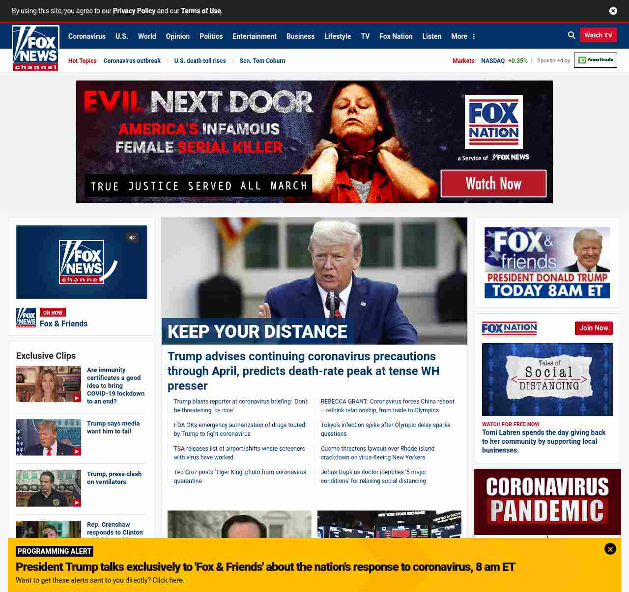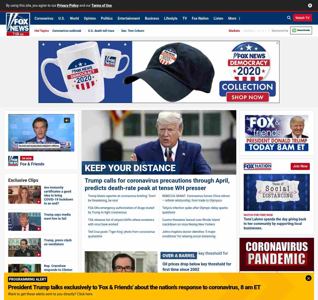 FN: [[KEEP YOUR DISTANCE]] Trump calls for coronavirus precautions through April, predicts death-rate peak at tense WH presser ((lubuntu at wor3))