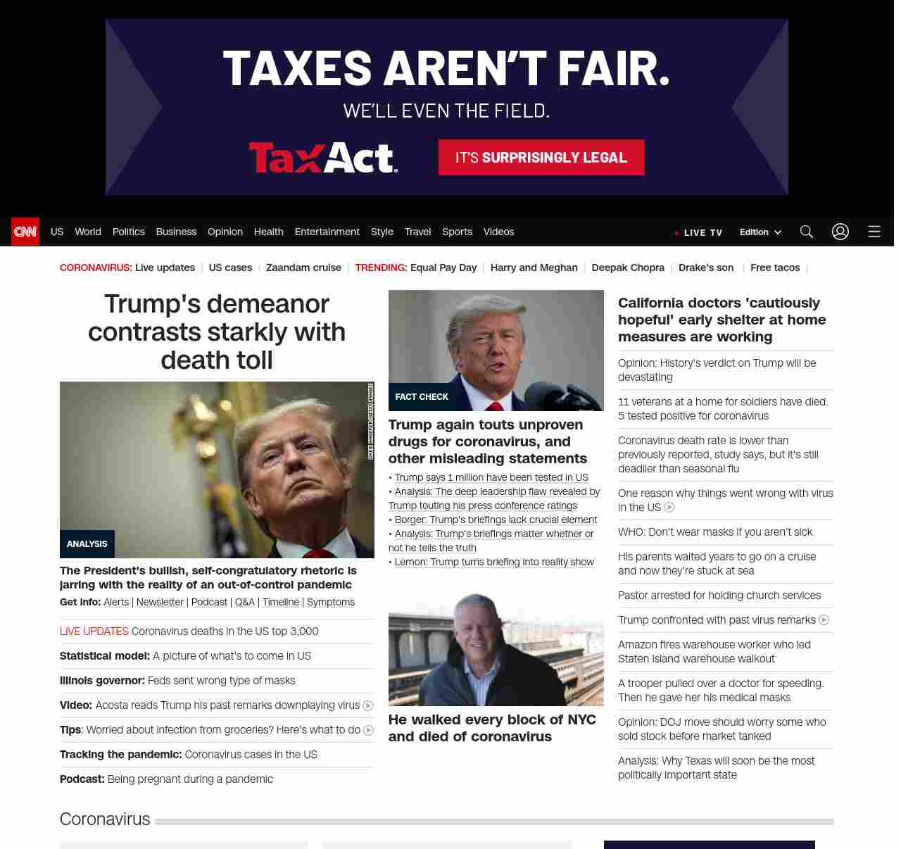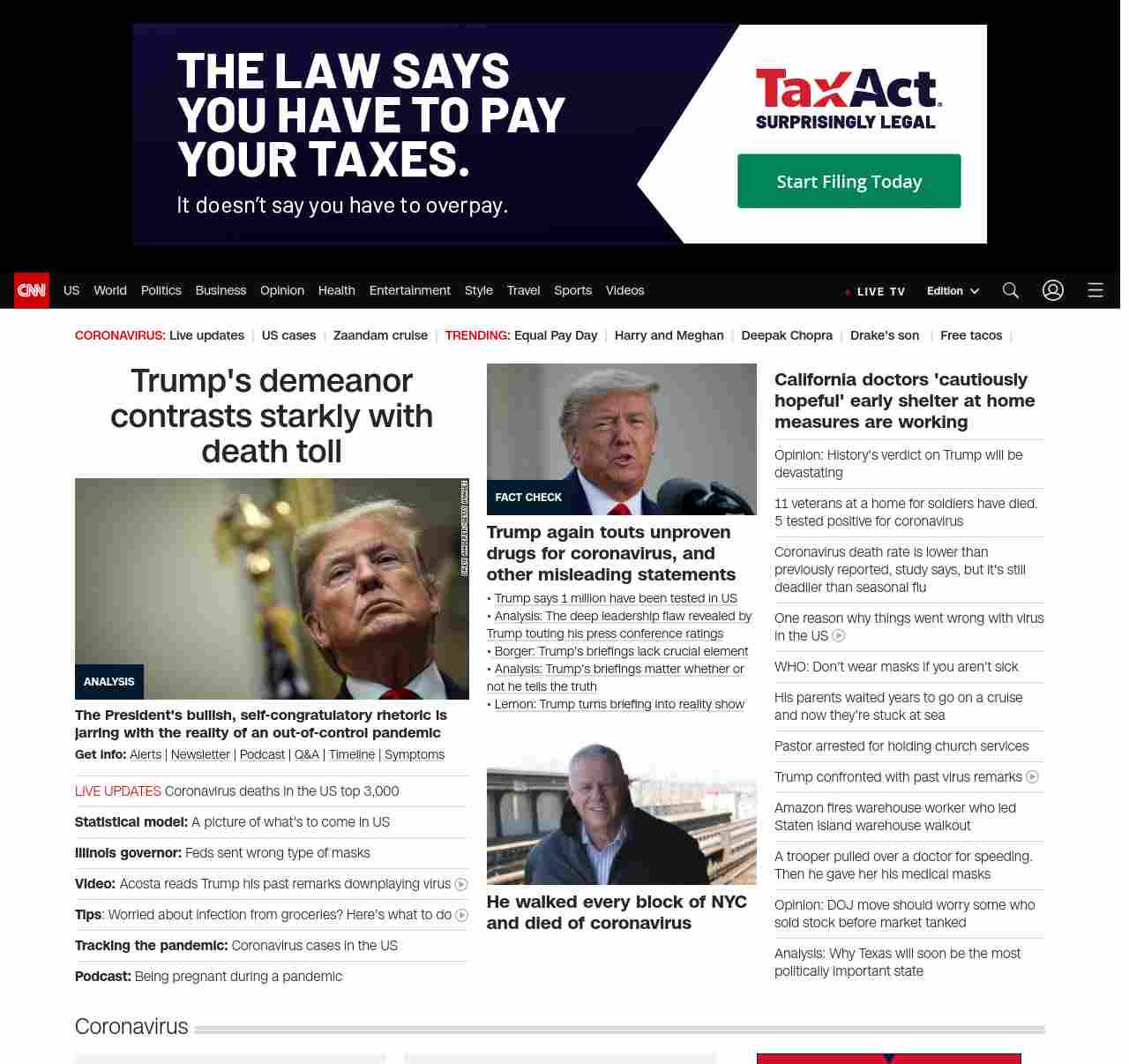 || screaming-banner-text banner-text-size–char-47″ data-analytics=”_list-hierarchical-xs_article_”> Trump’s demeanor contrasts starkly with death toll ||” , title: “CNN – Breaking News, Latest News and Videos” , siblings: {“articleList”:[{“uri”:”/2020/03/31/politics/donald-trump-coronavirus-politics-2020-election/index.html”,”headline”:”u003cstrong>The President’s bullish, self-congratulatory rhetoric is jarring with the reality of an out-of-control pandemic u003c/strong>”,”thumbnail”:”//cdn.cnn.com/cnnnext/dam/assets/200120121345-04-trump-0109-small-11.jpg”,”duration”:””,”description”:”u003cstrong>Get info:u003c/strong> u003ca href=”https://www.cnn.com/specials/mobile-apps” target=”_blank”>Alertsu003c/a> | u003ca href=”https://www.cnn.com/specials/coronavirus-newsletter?utm_source=hp&source=hp” target=”_blank”>Newsletteru003c/a> | u003ca href=”https://www.cnn.com/audio/podcasts/corona-virus”>Podcastu003c/a> | u003ca href=”https://www.cnn.com/interactive/2020/health/coronavirus-questions-answers/” target=”_blank”>Q&Au003c/a> | u003ca href=”https://www.cnn.com/2020/02/06/health/wuhan-coronavirus-timeline-fast-facts/index.html” target=”_blank”>Timelineu003c/a> | u003ca href=”https://www.cnn.com/2020/03/28/health/coronavirus-symptoms-list-what-to-do-wellness/index.html” target=”_blank”>Symptomsu003c/a>”,”layout”:””