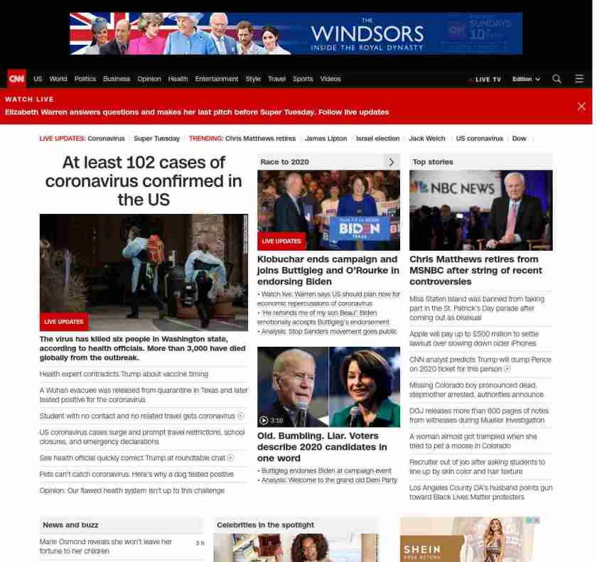 || screaming-banner-text banner-text-size–char-47″ data-analytics=”_list-hierarchical-xs_article_”> 102 cases of coronavirus confirmed in the US ||” , title: “CNN – Breaking News, Latest News and Videos” , siblings: {“articleList”:[{“uri”:”/asia/live-news/coronavirus-outbreak-03-03-20-intl-hnk/index.html”,”headline”:”u003cstrong>The virus has killed six people in Washington state, according to health officials. More than 3,000 have died globally from the outbreak. u003c/strong>”,”thumbnail”:”//cdn.cnn.com/cnnnext/dam/assets/200302151908-06-coronavirus-0301-washington-small-11.jpg”,”duration”:””,”description”:””,”layout”:””