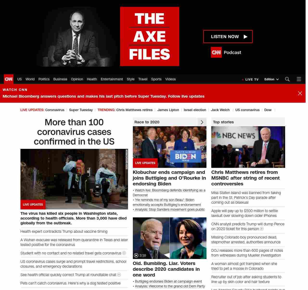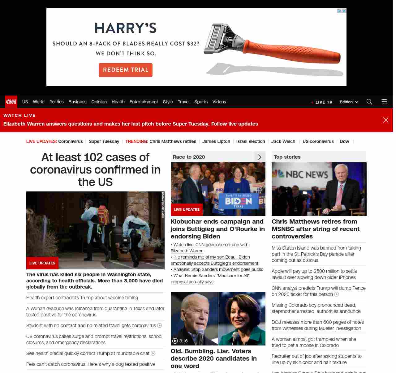 || screaming-banner-text banner-text-size–char-47″ data-analytics=”_list-hierarchical-xs_article_”> 102 cases of coronavirus confirmed in the US ||” , title: “CNN – Breaking News, Latest News and Videos” , siblings: {“articleList”:[{“uri”:”/asia/live-news/coronavirus-outbreak-03-03-20-intl-hnk/index.html”,”headline”:”u003cstrong>The virus has killed six people in Washington state, according to health officials. More than 3,000 have died globally from the outbreak. u003c/strong>”,”thumbnail”:”//cdn.cnn.com/cnnnext/dam/assets/200302151908-06-coronavirus-0301-washington-small-11.jpg”,”duration”:””,”description”:””,”layout”:””