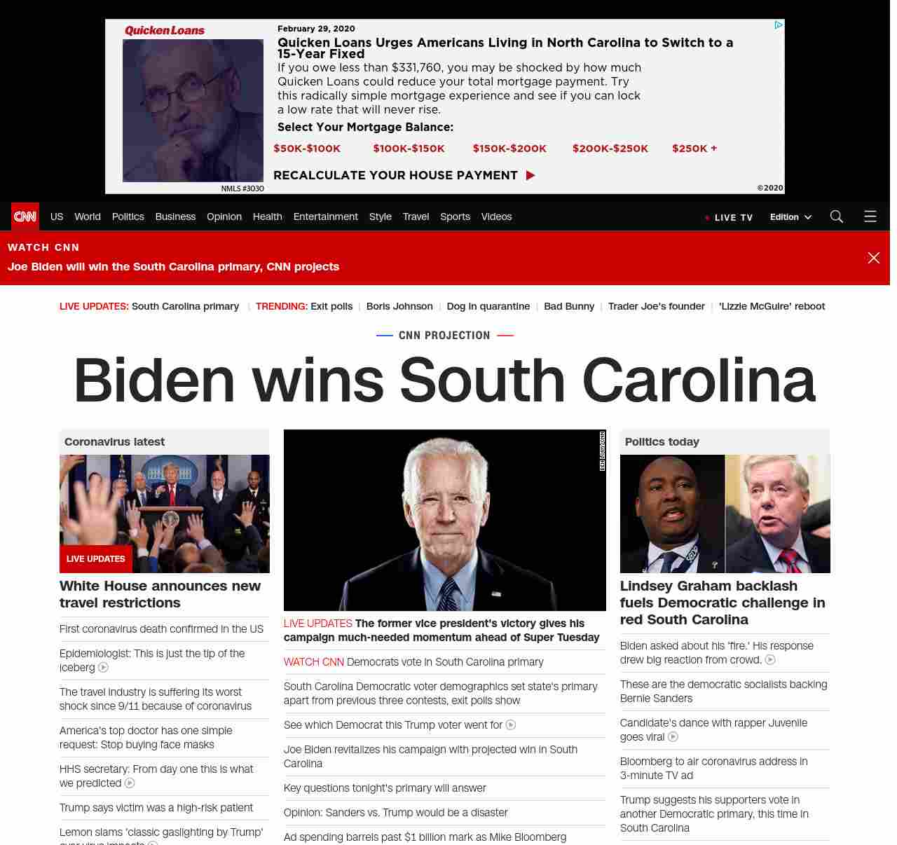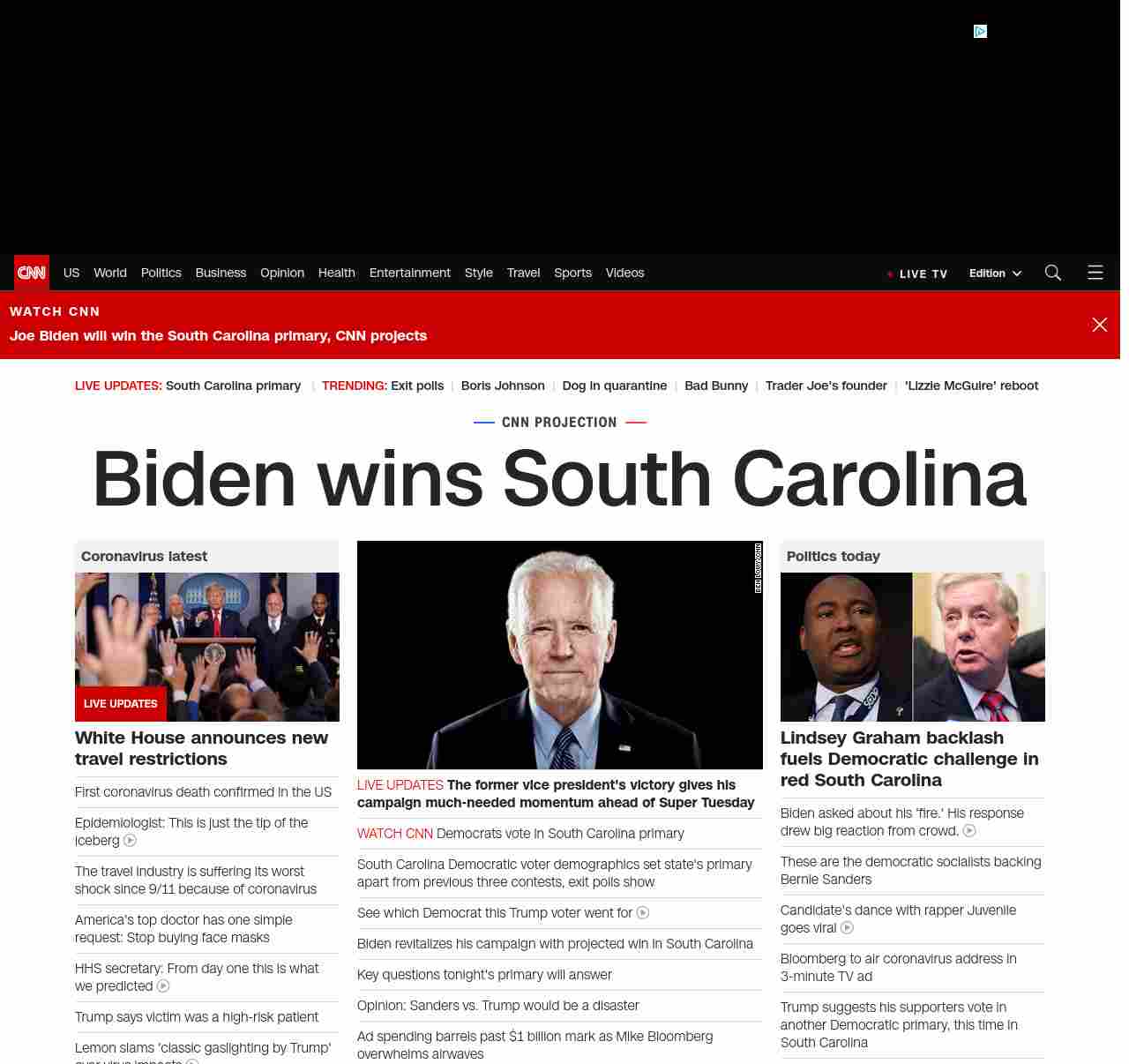 || banner-text–maximized banner-text-size–char-26″> Biden wins South Carolina ||” , title: “CNN – Breaking News, Latest News and Videos” , siblings: {“articleList”:[{“uri”:”/2020/02/29/health/us-coronavirus-saturday/index.html”,”headline”:”Administration expands travel restrictions”,”thumbnail”:”//cdn.cnn.com/cnnnext/dam/assets/200130165125-corona-virus-cdc-image-small-11.jpg”,”duration”:””,”description”:”There are now at least four u003ca href=”https://www.cnn.com/2020/02/28/health/coronavirus-us-updates-california-patient/index.html” target=”_blank”>US coronavirus casesu003c/a> without any related travel history, health officials say.”,”layout”:””