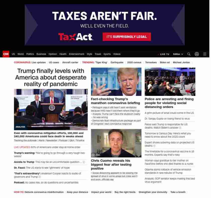 || screaming-banner-text banner-text-size–char-47″ data-analytics=”_list-hierarchical-xs_article_”> Trump finally levels with America about desperate reality of pandemic ||” , title: “CNN – Breaking News, Latest News and Videos” , siblings: {“articleList”:[{“uri”:”/2020/03/31/politics/trump-coronavirus/index.html”,”headline”:”u003cstrong>Even with coronavirus mitigation efforts, 100,000 to 240,000 Americans could face death in weeks aheadu003c/strong>”,”thumbnail”:”//cdn.cnn.com/cnnnext/dam/assets/200331180942-04-coronavirus-presser-0331-small-11.jpg”,”duration”:””,”description”:”u003ca href=”https://www.cnn.com/interactive/2020/health/coronavirus-us-maps-and-cases/” target=”_blank”>Tracking the outbreaku003c/a> | u003ca href=”https://www.cnn.com/specials/mobile-apps” target=”_blank”>Alertsu003c/a> | u003ca href=”https://www.cnn.com/specials/coronavirus-newsletter?utm_source=hp&source=hp” target=”_blank”>Newsletteru003c/a> | u003ca href=”https://www.cnn.com/audio/podcasts/corona-virus”>Podcastu003c/a> | u003ca href=”https://www.cnn.com/interactive/2020/health/coronavirus-questions-answers/” target=”_blank”>Q&Au003c/a> | u003ca href=”https://www.cnn.com/2020/02/06/health/wuhan-coronavirus-timeline-fast-facts/index.html” target=”_blank”>Timelineu003c/a> “,”layout”:””