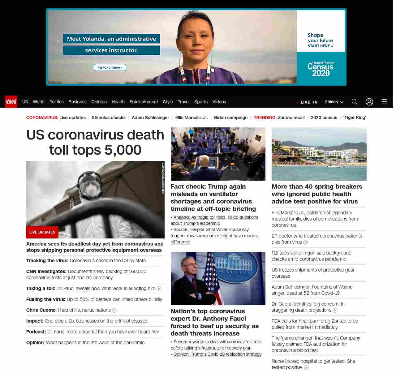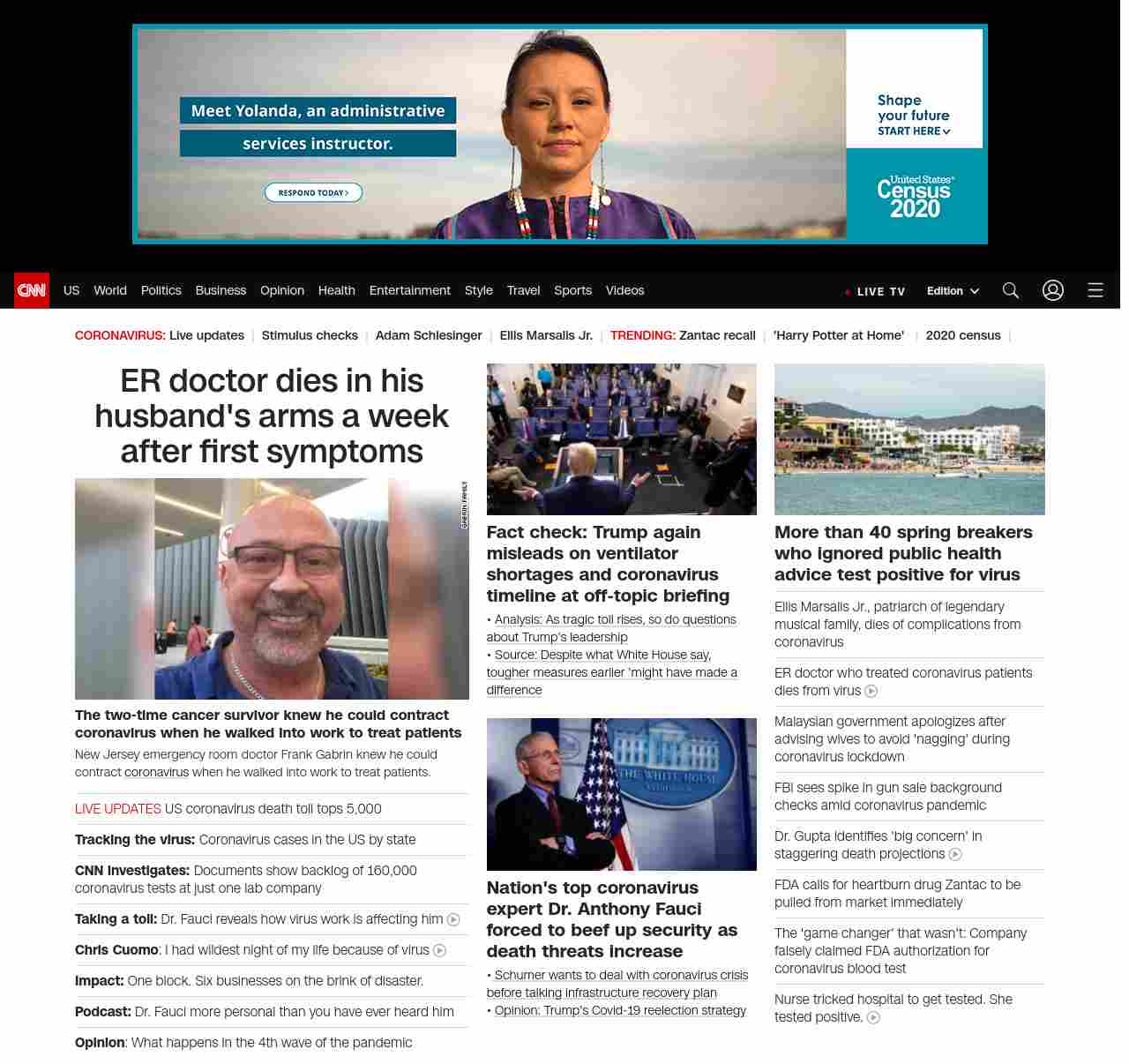|| screaming-banner-text banner-text-size–char-38″ data-analytics=”_list-hierarchical-xs_article_”> US coronavirus death toll tops 5,000 ||” , title: “CNN – Breaking News, Latest News and Videos” , siblings: {“articleList”:[{“uri”:”/2020/04/02/us/emergency-room-doctor-dies-coronavirus-husbands-arms/index.html”,”headline”:”u003cstrong>The two-time cancer survivor knew he could contract coronavirus when he walked into work to treat patientsu003c/strong>”,”thumbnail”:”//cdn.cnn.com/cnnnext/dam/assets/200402013749-frank-gabrin-small-11.jpg”,”duration”:””,”description”:”New Jersey emergency roomu003cstrong> u003c/strong>doctor Frank Gabrin knew he could contract u003ca href=”https://cnn.com/coronavirus-latest” target=”_blank”>coronavirusu003c/a> when he walked into work to treat patients.”,”layout”:””