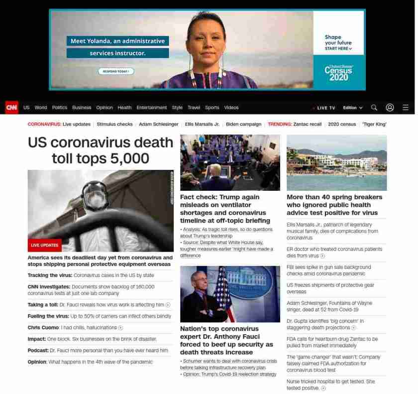 || screaming-banner-text banner-text-size–char-38″ data-analytics=”_list-hierarchical-xs_article_”> US coronavirus death toll tops 5,000 ||” , title: “CNN – Breaking News, Latest News and Videos” , siblings: {“articleList”:[{“uri”:”/world/live-news/coronavirus-pandemic-04-02-20-intl/index.html”,”headline”:”u003cstrong>America sees its deadliest day yet from coronavirus and stops shipping personal protective equipment overseasu003c/strong>”,”thumbnail”:”//cdn.cnn.com/cnnnext/dam/assets/200330085041-us-coronavirus-testing-nurse-0323-small-11.jpg”,”duration”:””,”description”:””,”layout”:””