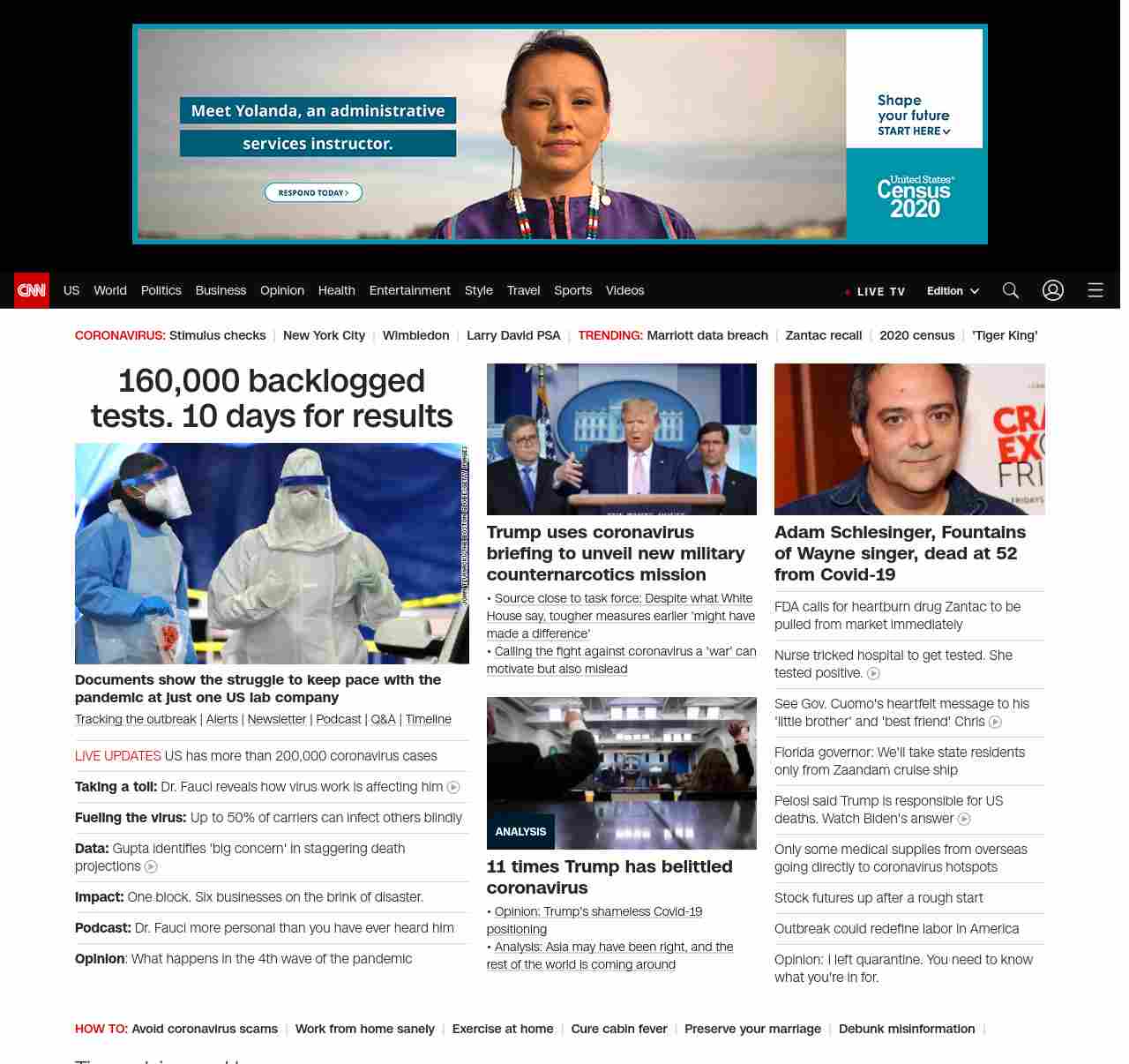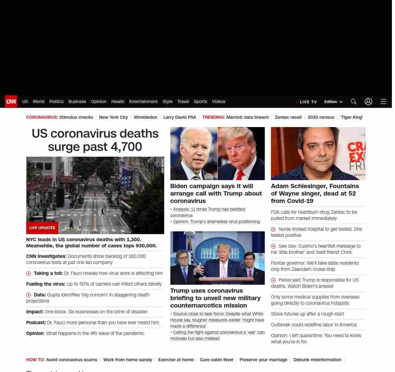 || screaming-banner-text banner-text-size–char-41″ data-analytics=”_list-hierarchical-xs_hyperlink_”> US coronavirus deaths surge past 4,700 ||” , title: “CNN – Breaking News, Latest News and Videos” , siblings: {“articleList”:[{“uri”:”/2020/04/01/politics/testing-backlog-coronavirus-quest-invs/index.html”,”headline”:”u003cstrong>CNN investigates: u003c/strong>Documents show backlog of 160,000 coronavirus tests at just one lab company”,”thumbnail”:”//cdn.cnn.com/cnnnext/dam/assets/200331194624-01-drive-through-testing-cvs-restricted-small-11.jpg”,”duration”:””,”description”:”u003ca href=”https://www.cnn.com/interactive/2020/health/coronavirus-us-maps-and-cases/” target=”_blank”>Tracking the outbreaku003c/a> | u003ca href=”https://www.cnn.com/specials/mobile-apps” target=”_blank”>Alertsu003c/a> | u003ca href=”https://www.cnn.com/specials/coronavirus-newsletter?utm_source=hp&source=hp” target=”_blank”>Newsletteru003c/a> | u003ca href=”https://www.cnn.com/audio/podcasts/corona-virus”>Podcastu003c/a> | u003ca href=”https://www.cnn.com/interactive/2020/health/coronavirus-questions-answers/” target=”_blank”>Q&Au003c/a> | u003ca href=”https://www.cnn.com/2020/02/06/health/wuhan-coronavirus-timeline-fast-facts/index.html” target=”_blank”>Timelineu003c/a> “,”layout”:””
