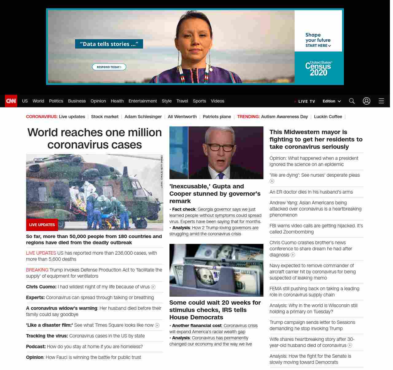 || screaming-banner-text banner-text-size–char-44″ data-analytics=”_list-hierarchical-xs_hyperlink_”> World reaches one million coronavirus cases ||” , title: “CNN – Breaking News, Latest News and Videos” , siblings: {“articleList”:[{“uri”:”/world/live-news/coronavirus-pandemic-04-02-20-intl/index.html”,”headline”:”US has reported more than 236,000 cases, with more than 5,600 deaths”,”thumbnail”:”//cdn.cnn.com/cnnnext/dam/assets/200330085041-us-coronavirus-testing-nurse-0323-small-11.jpg”,”duration”:””,”description”:””,”layout”:””
