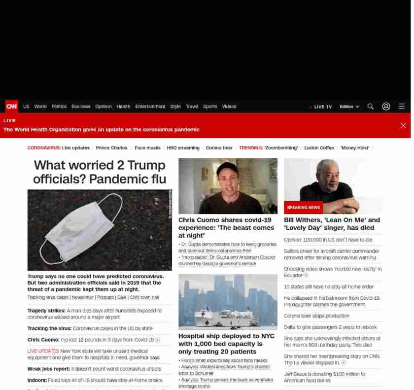 || screaming-banner-text banner-text-size–char-35″ data-analytics=”_list-hierarchical-xs_article_”> Top officials had pandemic fears ||” , title: “CNN – Breaking News, Latest News and Videos” , siblings: {“articleList”:[{“uri”:”/2020/04/03/politics/kfile-officials-worried-over-pandemic-last-year/index.html”,”headline”:”u003cstrong>Trump says no one could have predicted coronavirus. But two administration officials said in 2019 that the threat of a pandemic kept them up at night.u003c/strong>”,”thumbnail”:”//cdn.cnn.com/cnnnext/dam/assets/200403154706-us-coronavirus-face-mask-0331-small-11.jpg”,”duration”:””,”description”:”u003ca href=”https://www.cnn.com/interactive/2020/health/coronavirus-us-maps-and-cases/” target=”_blank”>Tracking virus casesu003c/a> | u003ca href=”https://www.cnn.com/specials/coronavirus-newsletter?utm_source=hp&source=hp” target=”_blank”>Newsletteru003c/a> | u003ca href=”https://www.cnn.com/audio/podcasts/corona-virus”>Podcastu003c/a> | u003ca href=”https://www.cnn.com/interactive/2020/health/coronavirus-questions-answers/” target=”_blank”>Q&Au003c/a> | u003ca href=”https://www.cnn.com/2020/04/02/app-news-section/full-coronavirus-town-hall-april-2-2020-app/index.html” target=”_blank”>CNN town hallu003c/a>”,”layout”:””