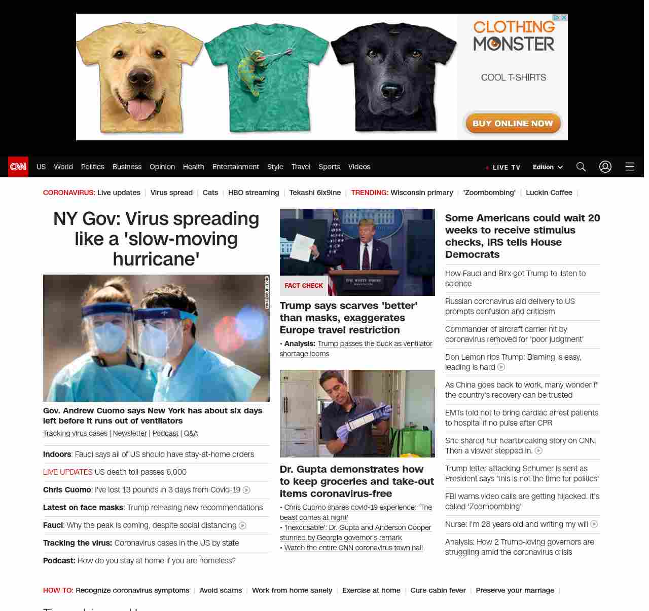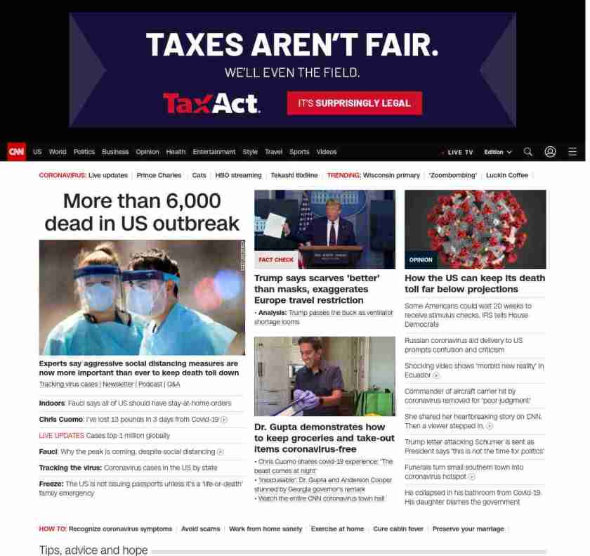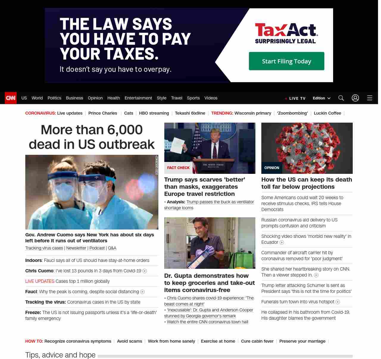 || screaming-banner-text banner-text-size–char-38″ data-analytics=”_list-hierarchical-xs_article_”> More than 6,000 dead in US outbreak ||” , title: “CNN – Breaking News, Latest News and Videos” , siblings: {“articleList”:[{“uri”:”/2020/04/03/health/us-coronavirus-friday/index.html”,”headline”:”u003cstrong>Experts say aggressive social distancing measures are now more important than ever to keep death toll downu003c/strong>”,”thumbnail”:”//cdn.cnn.com/cnnnext/dam/assets/200403033822-coronavirus-masks-0401-small-11.jpg”,”duration”:””,”description”:”u003ca href=”https://www.cnn.com/interactive/2020/health/coronavirus-us-maps-and-cases/” target=”_blank”>Tracking virus casesu003c/a> | u003ca href=”https://www.cnn.com/specials/coronavirus-newsletter?utm_source=hp&source=hp” target=”_blank”>Newsletteru003c/a> | u003ca href=”https://www.cnn.com/audio/podcasts/corona-virus”>Podcastu003c/a> | u003ca href=”https://www.cnn.com/interactive/2020/health/coronavirus-questions-answers/” target=”_blank”>Q&Au003c/a>”,”layout”:””