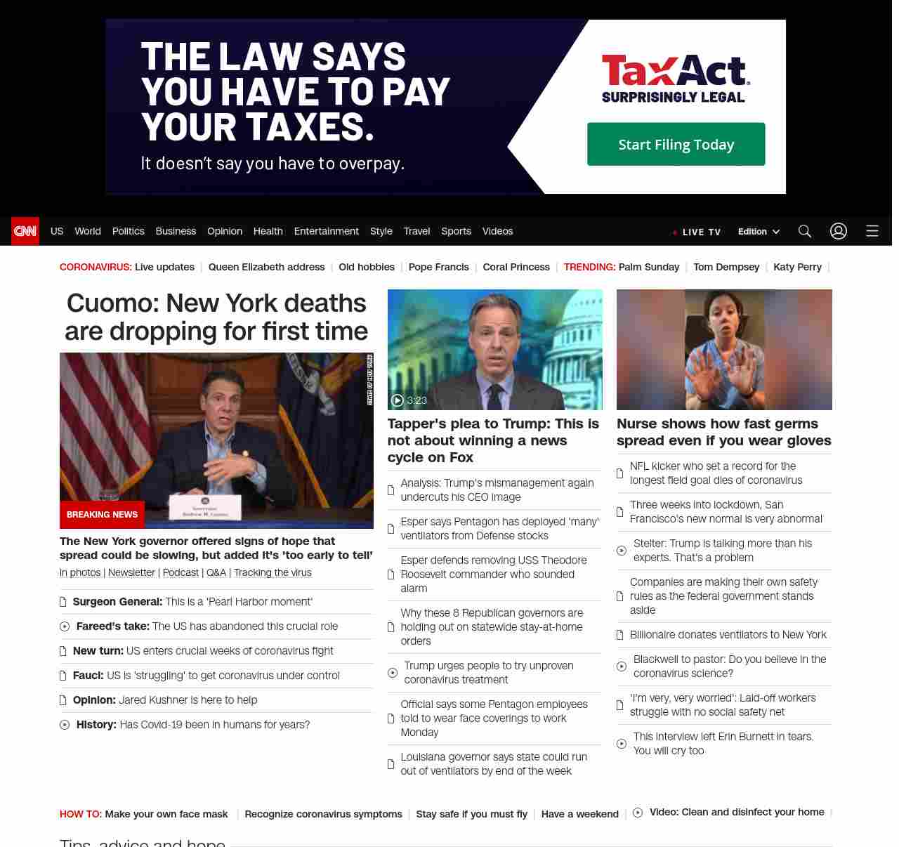 || screaming-banner-text banner-text-size–char-47″ data-analytics=”_list-hierarchical-xs_article_”> Cuomo: New York deaths are dropping for first time ||” , title: “CNN – Breaking News, Latest News and Videos” , siblings: {“articleList”:[{“uri”:”/world/live-news/coronavirus-pandemic-04-05-20/index.html”,”headline”:”u003cstrong>The New York governor offered signs of hope that spread could be slowing, but added it’s ‘too early to tell’u003c/strong>”,”thumbnail”:”//cdn.cnn.com/cnnnext/dam/assets/200405113015-01-cuomo-presser-0405-small-11.jpg”,”duration”:””,”description”:”u003ca href=”https://www.cnn.com/2020/03/19/world/gallery/novel-coronavirus-outbreak/index.html” target=”_blank”>In photos u003c/a>| u003ca href=”https://www.cnn.com/specials/coronavirus-newsletter?utm_source=hp&source=hp” target=”_blank”>Newsletteru003c/a> | u003ca href=”https://www.cnn.com/audio/podcasts/corona-virus”>Podcastu003c/a> | u003ca href=”https://www.cnn.com/interactive/2020/health/coronavirus-questions-answers/” target=”_blank”>Q&Au003c/a> | u003ca href=”https://www.cnn.com/interactive/2020/health/coronavirus-us-maps-and-cases/” target=”_blank”>Tracking the virusu003c/a>”,”layout”:””