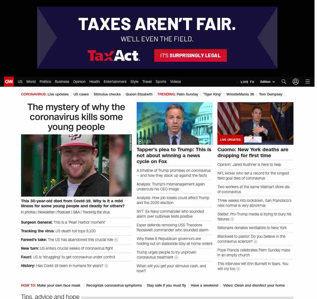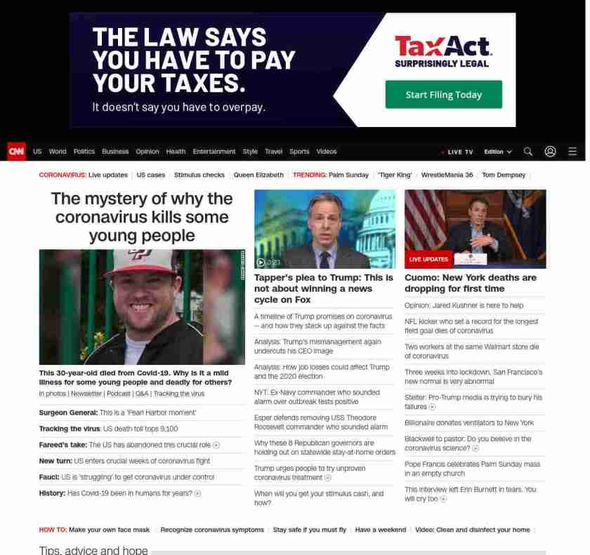 || screaming-banner-text banner-text-size–char-47″ data-analytics=”_list-hierarchical-xs_article_”> The mystery of why the coronavirus kills some young people ||” , title: “CNN – Breaking News, Latest News and Videos” , siblings: {“articleList”:[{“uri”:”/2020/04/05/politics/jerome-adams-coronavirus/index.html”,”headline”:”u003cstrong>Surgeon General:u003c/strong> This is a ‘Pearl Harbor moment'”,”thumbnail”:”//cdn.cnn.com/cnnnext/dam/assets/200323182037-us-surgeon-general-jerome-adams-small-11.jpg”,”duration”:””,”description”:”u003ca href=”https://www.cnn.com/2020/03/19/world/gallery/novel-coronavirus-outbreak/index.html” target=”_blank”>In photos u003c/a>| u003ca href=”https://www.cnn.com/specials/coronavirus-newsletter?utm_source=hp&source=hp” target=”_blank”>Newsletteru003c/a> | u003ca href=”https://www.cnn.com/audio/podcasts/corona-virus”>Podcastu003c/a> | u003ca href=”https://www.cnn.com/interactive/2020/health/coronavirus-questions-answers/” target=”_blank”>Q&Au003c/a> | u003ca href=”https://www.cnn.com/interactive/2020/health/coronavirus-us-maps-and-cases/” target=”_blank”>Tracking the virusu003c/a>”,”layout”:””