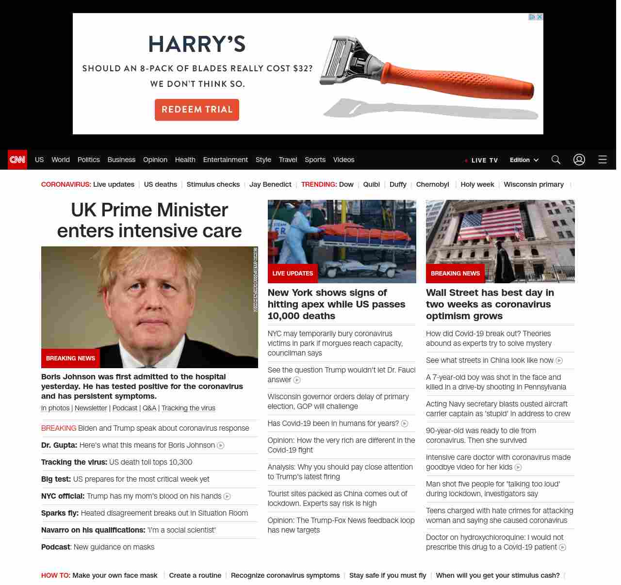 || screaming-banner-text banner-text-size–char-41″ data-analytics=”_list-hierarchical-xs_hyperlink_”> UK Prime Minister enters intensive care ||” , title: “CNN – Breaking News, Latest News and Videos” , siblings: {“articleList”:[{“uri”:”/2020/04/06/politics/biden-trump-call/index.html”,”headline”:”Biden and Trump speak about coronavirus response “,”thumbnail”:”//cdn.cnn.com/cnnnext/dam/assets/191205005729-joe-biden-donald-trump-split-file-small-11.jpg”,”duration”:””,”description”:”Former Vice President u003ca href=”https://www.cnn.com/election/2020/candidate/biden” target=”_blank”>Joe Bidenu003c/a> and President u003ca href=”https://www.cnn.com/election/2020/candidate/trump” target=”_blank”>Donald Trumpu003c/a> spoke by phone on Monday about the response to the coronavirus pandemic, a source familiar with the call and a White House official tell CNN.”,”layout”:””