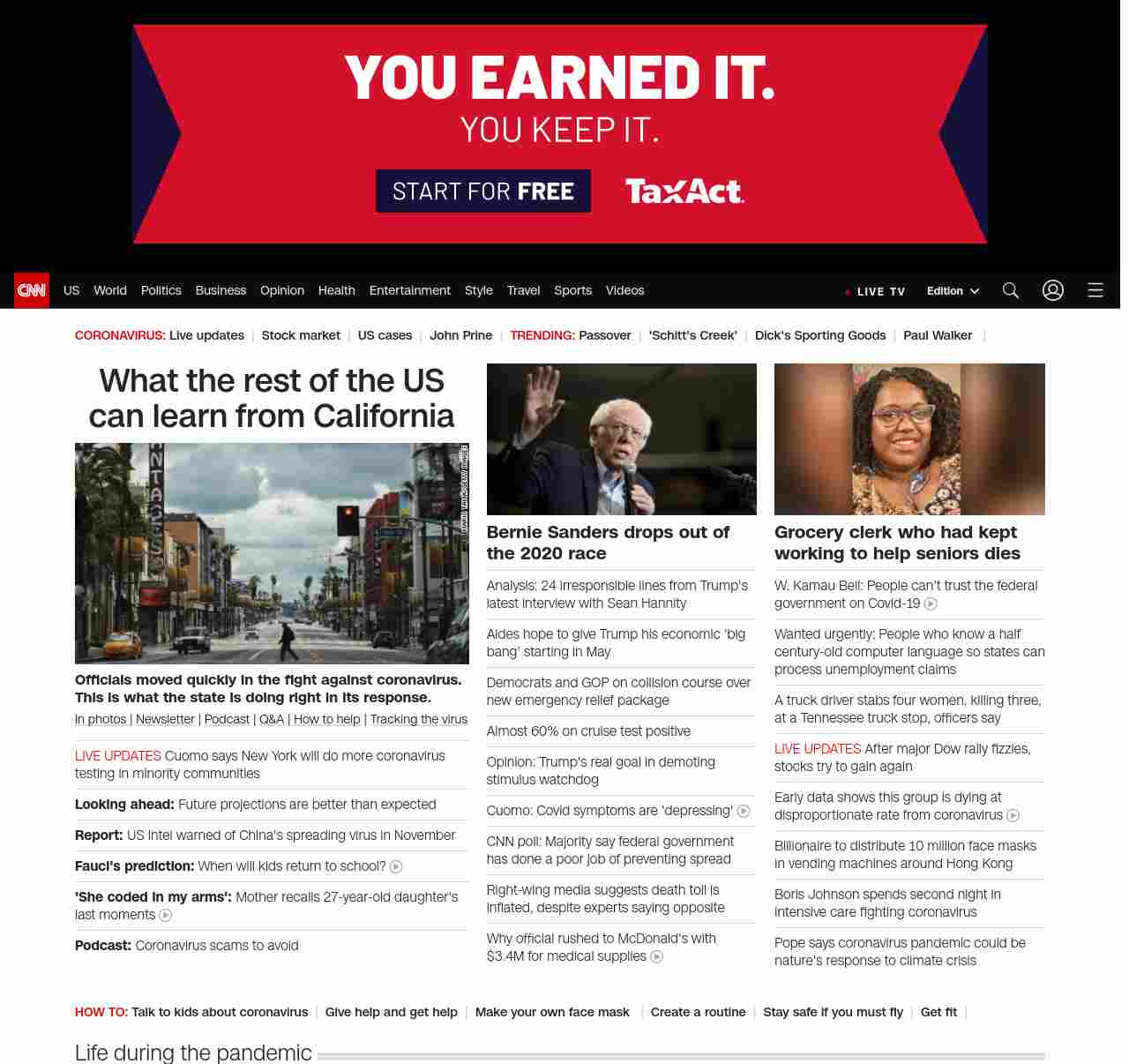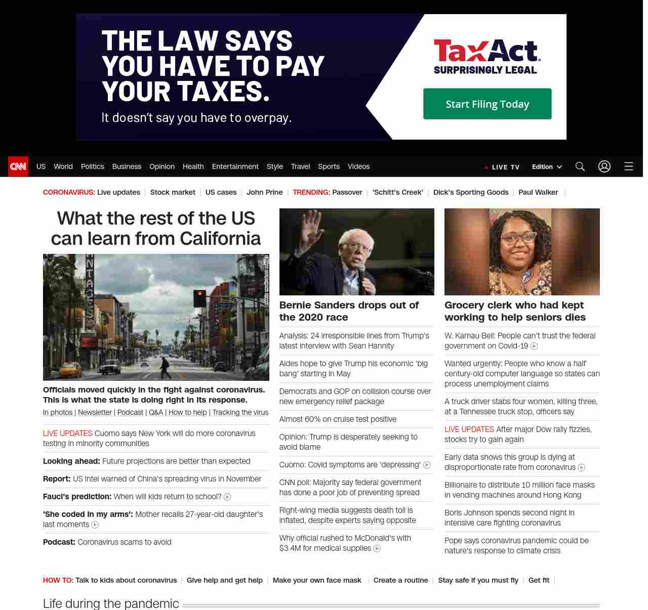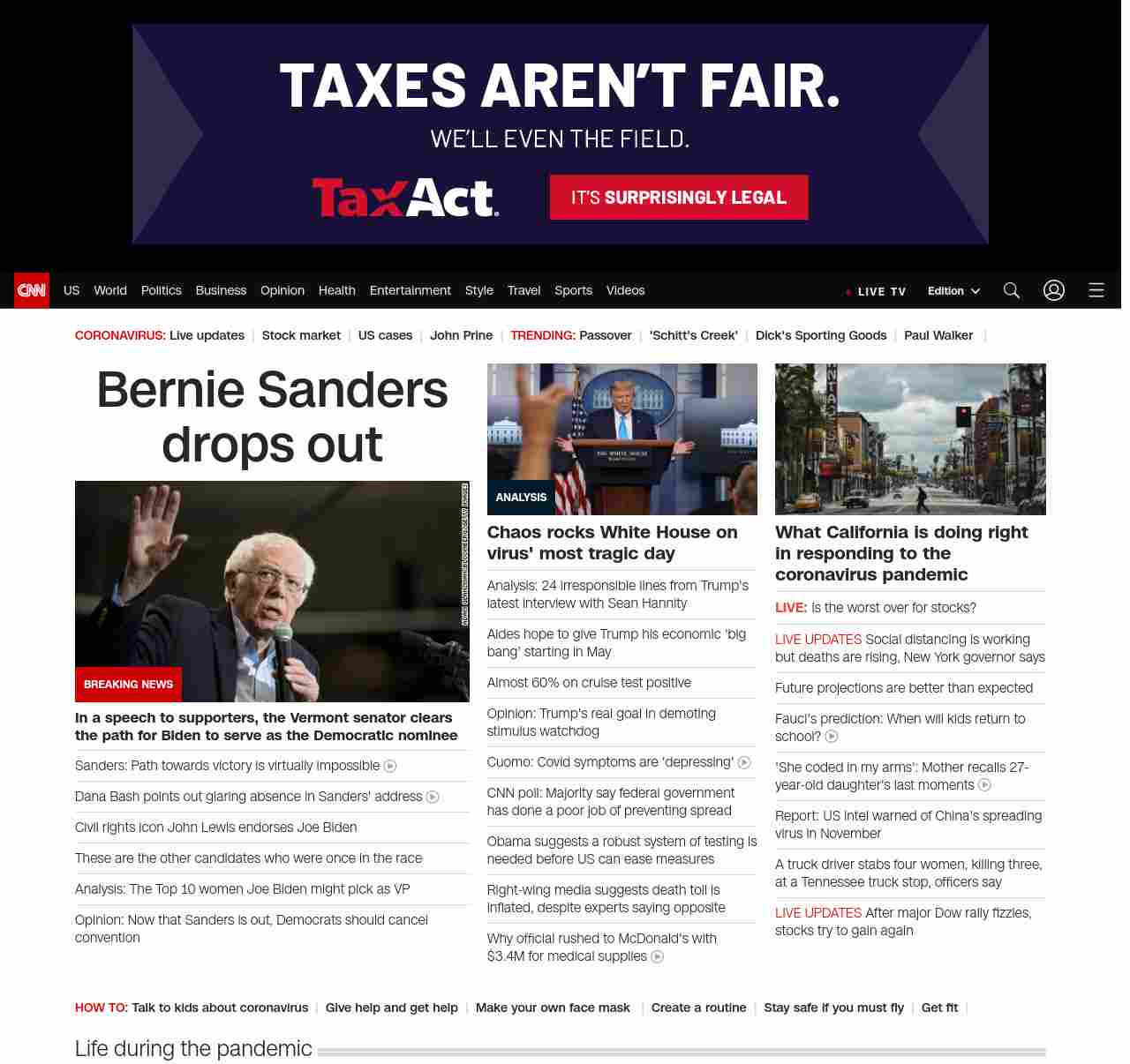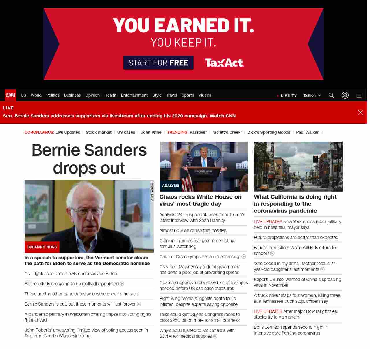 || screaming-banner-text banner-text-size–char-26″ data-analytics=”_list-hierarchical-xs_hyperlink_”> Bernie Sanders drops out ||” , title: “CNN – Breaking News, Latest News and Videos” , siblings: {“articleList”:[{“uri”:”/2020/04/07/politics/john-lewis-endorses-joe-biden/index.html”,”headline”:”Civil rights icon John Lewis endorses Joe Biden”,”thumbnail”:”//cdn.cnn.com/cnnnext/dam/assets/200220181835-john-lewis-80th-birthday-small-11.jpg”,”duration”:””,”description”:”Civil rights icon and Democratic Rep. u003ca href=”https://www.cnn.com/2013/02/22/us/john-lewis-fast-facts/index.html” target=”_blank”>John Lewisu003c/a> is endorsing u003ca href=”https://www.cnn.com/election/2020/candidate/biden” target=”_blank”>Joe Bidenu003c/a>, promising to campaign for the former vice president and saying that “we need his leadership now more than ever before.””,”layout”:””