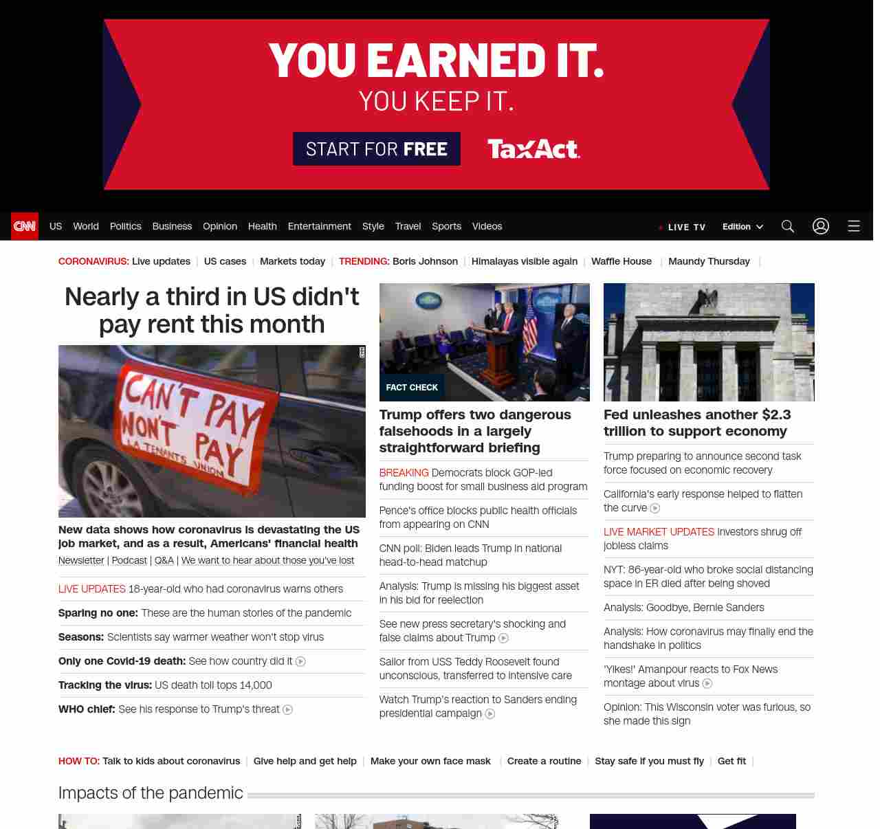 || screaming-banner-text banner-text-size–char-32″ data-analytics=”_list-hierarchical-xs_hyperlink_”> Coronavirus chaos spares no one ||” , title: “CNN – Breaking News, Latest News and Videos” , siblings: {“articleList”:[{“uri”:”/2020/04/09/business/americans-rent-payment-trnd/index.html”,”headline”:”New data shows how coronavirus is devastating the US job market, and as a result, Americans’ financial health”,”thumbnail”:”//cdn.cnn.com/cnnnext/dam/assets/200401201034-renters-strike-lah-pkg-small-11.jpg”,”duration”:””,”description”:”u003ca href=”https://www.cnn.com/specials/coronavirus-newsletter?utm_source=hp&source=hp” target=”_blank”>Newsletteru003c/a> | u003ca href=”https://www.cnn.com/audio/podcasts/corona-virus”>Podcastu003c/a> | u003ca href=”https://www.cnn.com/interactive/2020/health/coronavirus-questions-answers/” target=”_blank”>Q&Au003c/a> | u003ca href=”https://www.cnn.com/2020/04/08/health/share-coronavirus-covid19-victims-memories/index.html” target=”_blank”>We want to hear about those you’ve lostu003c/a>”,”layout”:””