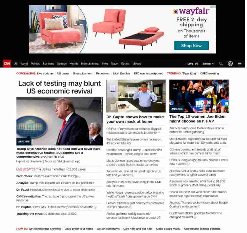 || screaming-banner-text banner-text-size–char-47″ data-analytics=”_list-hierarchical-xs_article_”> Trump tries to push fast-forward on the pandemic ||” , title: “CNN – Breaking News, Latest News and Videos” , siblings: {“articleList”:[{“uri”:”/2020/04/10/politics/donald-trump-testing-economy-coronavirus/index.html”,”headline”:”u003cstrong>Trump says America does not need and will never have mass coronavirus testing, but experts say a comprehensive program is vitalu003c/strong>”,”thumbnail”:”//cdn.cnn.com/cnnnext/dam/assets/200409183935-02-coronavirus-briefing-0409-small-11.jpg”,”duration”:””,”description”:”u003ca href=”https://www.cnn.com/2020/03/19/world/gallery/novel-coronavirus-outbreak/index.html” target=”_blank”>In photos u003c/a>| u003ca href=”https://www.cnn.com/specials/coronavirus-newsletter?utm_source=hp&source=hp” target=”_blank”>Newsletteru003c/a> | u003ca href=”https://www.cnn.com/audio/podcasts/corona-virus”>Podcastu003c/a> | u003ca href=”https://www.cnn.com/interactive/2020/health/coronavirus-questions-answers/” target=”_blank”>Q&Au003c/a> | u003ca href=”https://www.cnn.com/interactive/2020/health/coronavirus-how-to-help/” target=”_blank”>How to helpu003c/a>”,”layout”:””