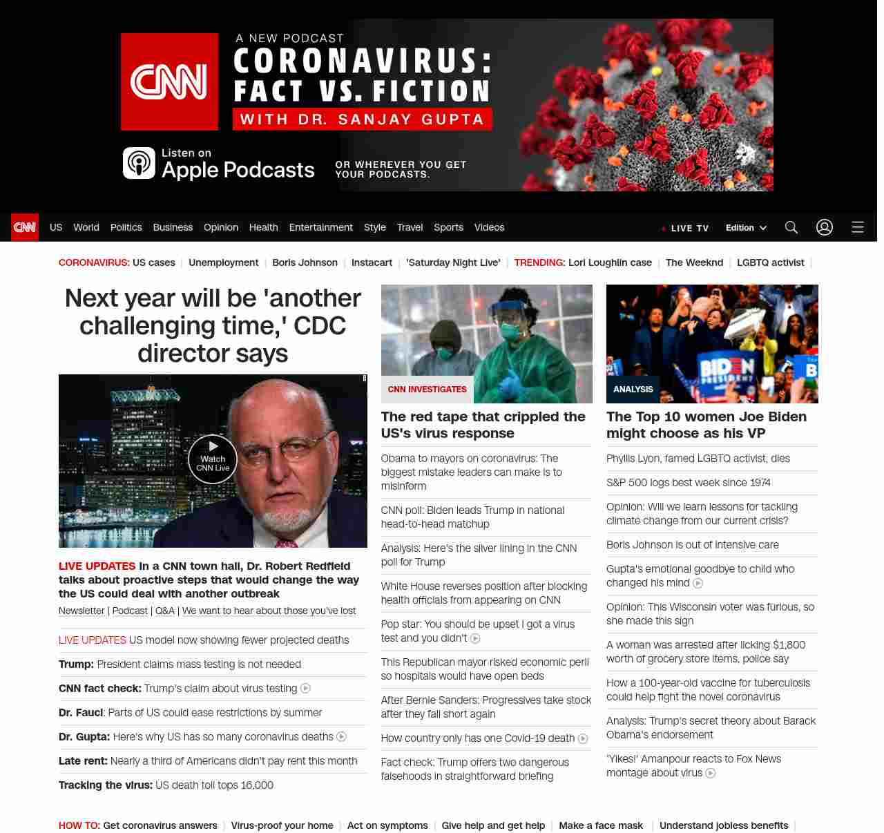 || screaming-banner-text banner-text-size–char-47″ data-analytics=”_list-hierarchical-xs_story_”> US is coming to peak of pandemic, CDC director says ||” , title: “CNN – Breaking News, Latest News and Videos” , siblings: {“articleList”:[{“uri”:”/2020/04/09/politics/trump-coronavirus-tests/index.html”,”headline”:”u003cstrong>Trump: u003c/strong>President claims mass testing is not needed”,”thumbnail”:”//cdn.cnn.com/cnnnext/dam/assets/200409183814-01-coronavirus-briefing-0409-small-11.jpg”,”duration”:””,”description”:”President Donald Trump said Thursday that there have been more than two million u003ca href=”https://www.cnn.com/world/live-news/coronavirus-pandemic-04-09-20/index.html” target=”_blank”>coronavirusu003c/a> tests conducted in the United States but u003ca href=”https://www.cnn.com/2020/04/01/politics/testing-backlog-coronavirus-quest-invs/index.html” target=”_blank”>conceded that mass testing is not going to happen.u003c/a>”,”layout”:””
