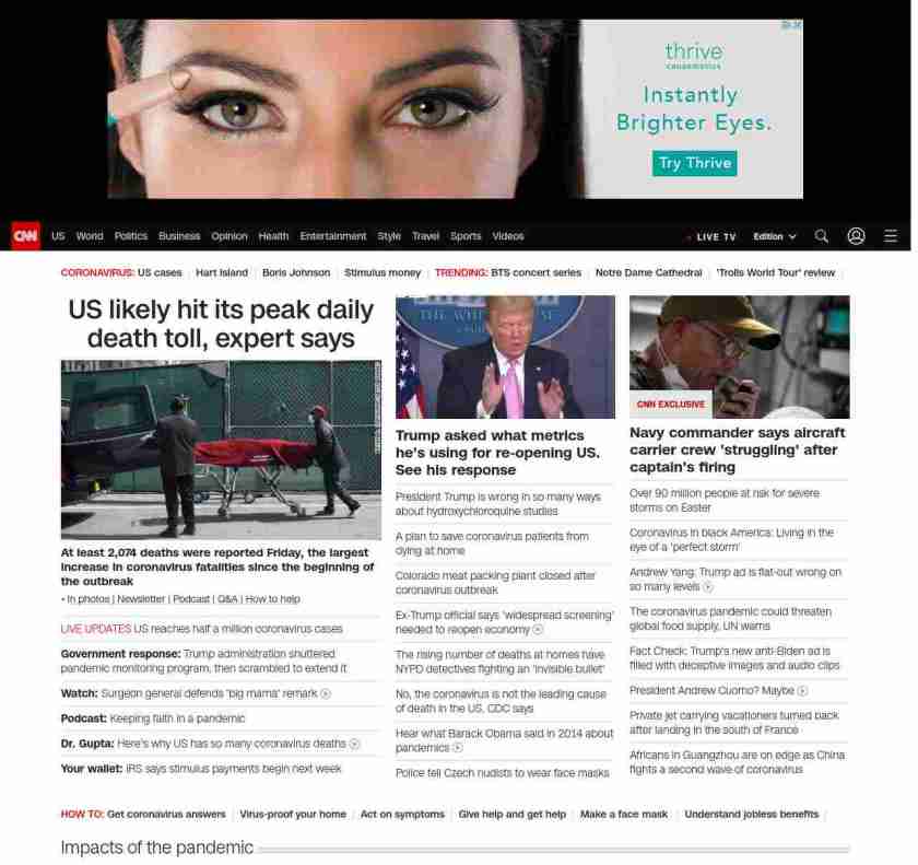 || screaming-banner-text banner-text-size–char-47″ data-analytics=”_list-hierarchical-xs_article_”> US likely hit its peak death toll, expert says ||” , title: “CNN – Breaking News, Latest News and Videos” , siblings: {“articleList”:[{“uri”:”/2020/04/11/health/us-coronavirus-updates-saturday/index.html”,”headline”:”u003cstrong>At least 2,074 deaths were reported Friday, the largest increase in coronavirus fatalities since the beginning of the outbreaku003c/strong>”,”thumbnail”:”//cdn.cnn.com/cnnnext/dam/assets/200411014048-coronavirus-main-0411-new-york-small-11.jpg”,”duration”:””,”description”:”⢠u003ca href=”https://www.cnn.com/2020/03/19/world/gallery/novel-coronavirus-outbreak/index.html” target=”_blank”>In photos u003c/a>| u003ca href=”https://www.cnn.com/specials/coronavirus-newsletter?utm_source=hp&source=hp” target=”_blank”>Newsletteru003c/a> | u003ca href=”https://www.cnn.com/audio/podcasts/corona-virus”>Podcastu003c/a> | u003ca href=”https://www.cnn.com/interactive/2020/health/coronavirus-questions-answers/” target=”_blank”>Q&Au003c/a> | u003ca href=”https://www.cnn.com/interactive/2020/health/coronavirus-how-to-help/” target=”_blank”>How to helpu003c/a>”,”layout”:””
