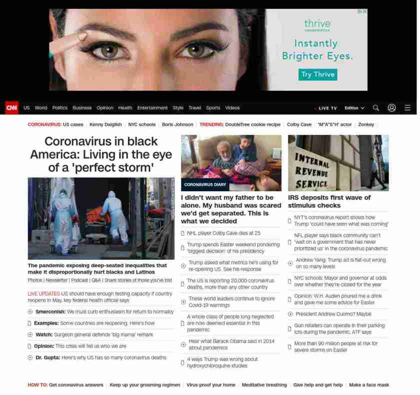 || screaming-banner-text banner-text-size–char-47″ data-analytics=”_list-hierarchical-xs_article_”> Coronavirus in black America: Living in the eye of a ‘perfect storm’ ||” , title: “CNN – Breaking News, Latest News and Videos” , siblings: {“articleList”:[{“uri”:”/2020/04/11/us/coronavirus-black-americans-deaths/index.html”,”headline”:”u003cstrong>The pandemic is exposing deep-seated inequalities that make it disproportionally hurt blacks and Latinosu003c/strong>”,”thumbnail”:”//cdn.cnn.com/cnnnext/dam/assets/200404195352-02-coronavirus-deaths-new-york-0404-small-11.jpg”,”duration”:””,”description”:”u003ca href=”https://www.cnn.com/2020/03/19/world/gallery/novel-coronavirus-outbreak/index.html” target=”_blank”>Photos u003c/a>| u003ca href=”https://www.cnn.com/specials/coronavirus-newsletter?utm_source=hp&source=hp” target=”_blank”>Newsletteru003c/a> | u003ca href=”https://www.cnn.com/audio/podcasts/corona-virus”>Podcastu003c/a> | u003ca href=”https://www.cnn.com/interactive/2020/health/coronavirus-questions-answers/” target=”_blank”>Q&Au003c/a> | u003ca href=”https://www.cnn.com/2020/04/08/health/share-coronavirus-covid19-victims-memories/index.html” target=”_blank”>Share stories of those you’ve lostu003c/a>”,”layout”:””