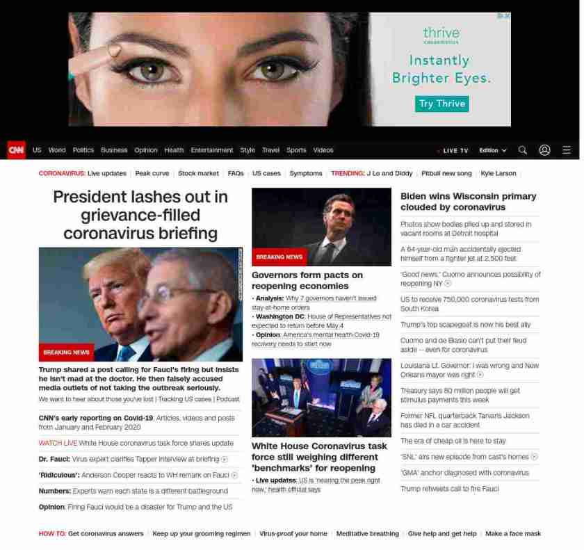 || screaming-banner-text banner-text-size–char-47″ data-analytics=”_list-hierarchical-xs_article_”> President lashes out in grievance-filled coronavirus briefing ||” , title: “CNN – Breaking News, Latest News and Videos” , siblings: {“articleList”:[{“uri”:”/2020/04/13/politics/trump-coronavirus-defense-fauci/index.html”,”headline”:”u003cstrong>Trump shared a post calling for Fauci’s firing but insists he isn’t mad at the doctor. He then falsely accused media outlets of not taking the outbreak seriously.u003c/strong>”,”thumbnail”:”//cdn.cnn.com/cnnnext/dam/assets/200413100246-01-trump-fauci-0321-small-11.jpg”,”duration”:””,”description”:”u003ca href=”https://www.cnn.com/2020/04/08/health/share-coronavirus-covid19-victims-memories/index.html” target=”_blank”>We want to hear about those you’ve lostu003c/a> | u003ca href=”https://www.cnn.com/interactive/2020/health/coronavirus-us-maps-and-cases/” target=”_blank”>Tracking US cases u003c/a>| u003ca href=”https://www.cnn.com/audio/podcasts/corona-virus”>Podcastu003c/a>u003cbr />”,”layout”:””