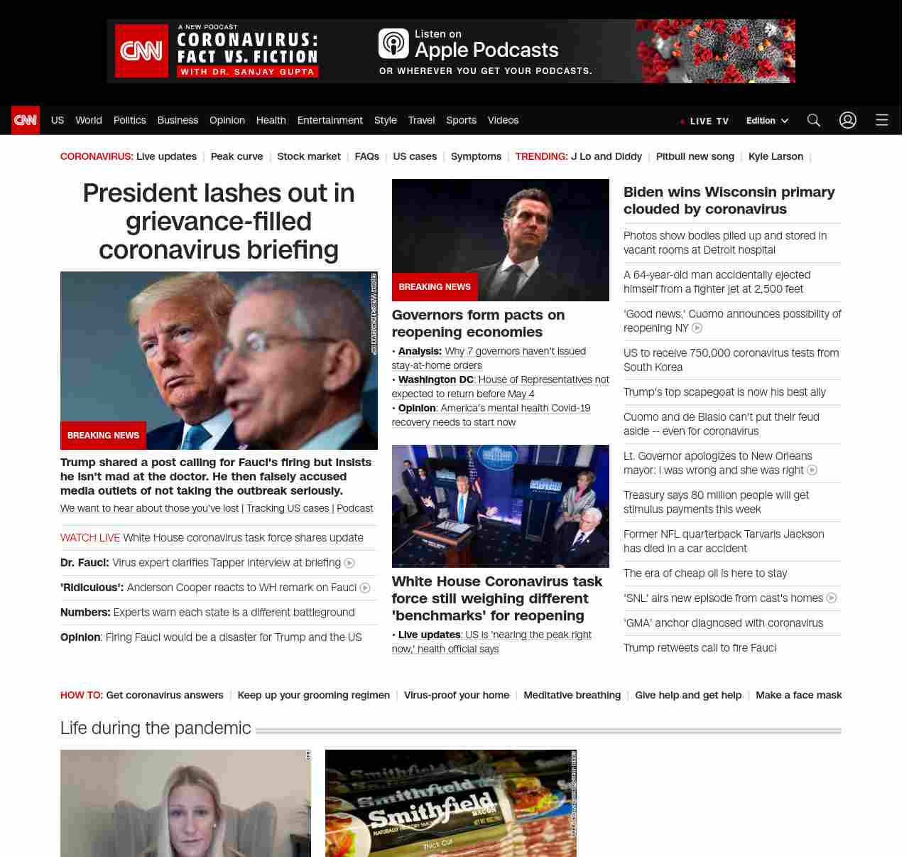 || screaming-banner-text banner-text-size–char-47″ data-analytics=”_list-hierarchical-xs_article_”> President lashes out in grievance-filled coronavirus briefing ||” , title: “CNN – Breaking News, Latest News and Videos” , siblings: {“articleList”:[{“uri”:”/2020/04/13/politics/trump-coronavirus-defense-fauci/index.html”,”headline”:”u003cstrong>Trump shared a post calling for Fauci’s firing but insists he isn’t mad at the doctor. He then falsely accused media outlets of not taking the outbreak seriously.u003c/strong>”,”thumbnail”:”//cdn.cnn.com/cnnnext/dam/assets/200413100246-01-trump-fauci-0321-small-11.jpg”,”duration”:””,”description”:”u003ca href=”https://www.cnn.com/2020/04/08/health/share-coronavirus-covid19-victims-memories/index.html” target=”_blank”>We want to hear about those you’ve lostu003c/a> | u003ca href=”https://www.cnn.com/interactive/2020/health/coronavirus-us-maps-and-cases/” target=”_blank”>Tracking US cases u003c/a>| u003ca href=”https://www.cnn.com/audio/podcasts/corona-virus”>Podcastu003c/a>u003cbr />”,”layout”:””