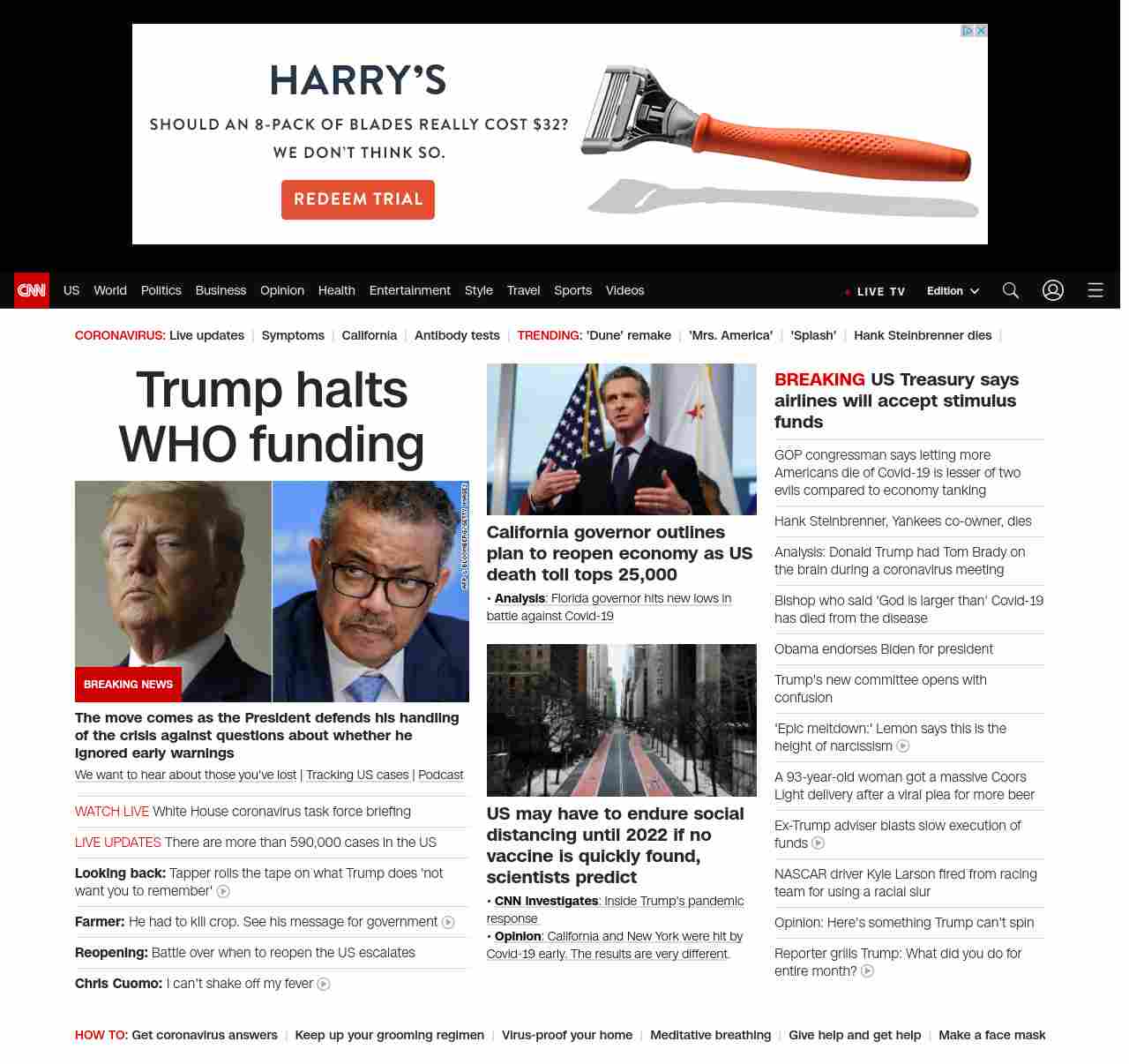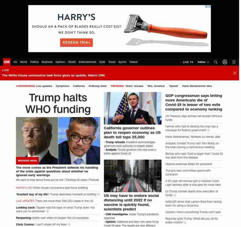 || screaming-banner-text banner-text-size–char-26″ data-analytics=”_list-hierarchical-xs_hyperlink_”> Trump halts WHO funding ||” , title: “CNN – Breaking News, Latest News and Videos” , siblings: {“articleList”:[{“uri”:”/videos/politics/2020/04/14/trump-scariest-day-ventilators-coronavirus-briefing-vpx.cnn”,”headline”:”u003cstrong>’Scariest day’: u003c/strong>Trump describes moment at briefing”,”thumbnail”:”//cdn.cnn.com/cnnnext/dam/assets/200414182637-01-coronavirus-briefing-trump-0414-small-11.jpg”,”duration”:”01:24″,”description”:”President Trump says his “scariest day” happened last month when he was told the US had a shortage of ventilators. “,”layout”:””,”iconType”:”video”