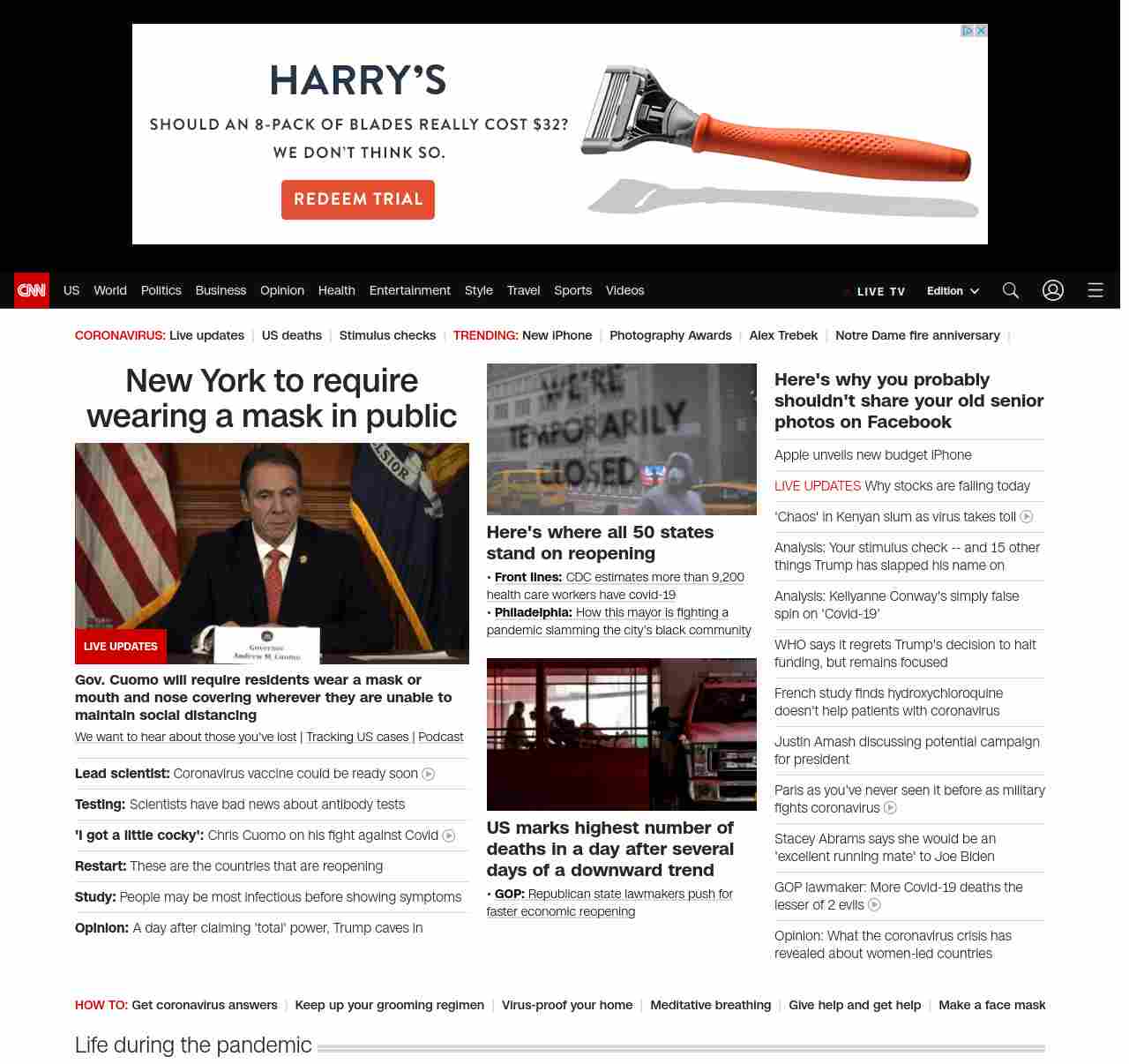 || screaming-banner-text banner-text-size–char-47″ data-analytics=”_list-hierarchical-xs_hyperlink_”> New York to require wearing a mask in public ||” , title: “CNN – Breaking News, Latest News and Videos” , siblings: {“articleList”:[{“uri”:”/videos/health/2020/04/15/coronavirus-vaccine-timeline-acfc-vpx.cnn”,”headline”:”u003cstrong>Lead scientist:u003c/strong> Coronavirus vaccine could be ready soon”,”thumbnail”:”//cdn.cnn.com/cnnnext/dam/assets/200415095753-kizzmekia-corbet-small-11.jpg”,”duration”:”01:35″,”description”:”Kizzmekia Corbett, the National Institute of Health’s lead scientist for coronavirus vaccine research tells CNN’s Anderson Cooper and Dr. Sanjay Gupta that a vaccine for coronavirus could possibly be available to the general public by next spring.”,”layout”:””,”iconType”:”video”