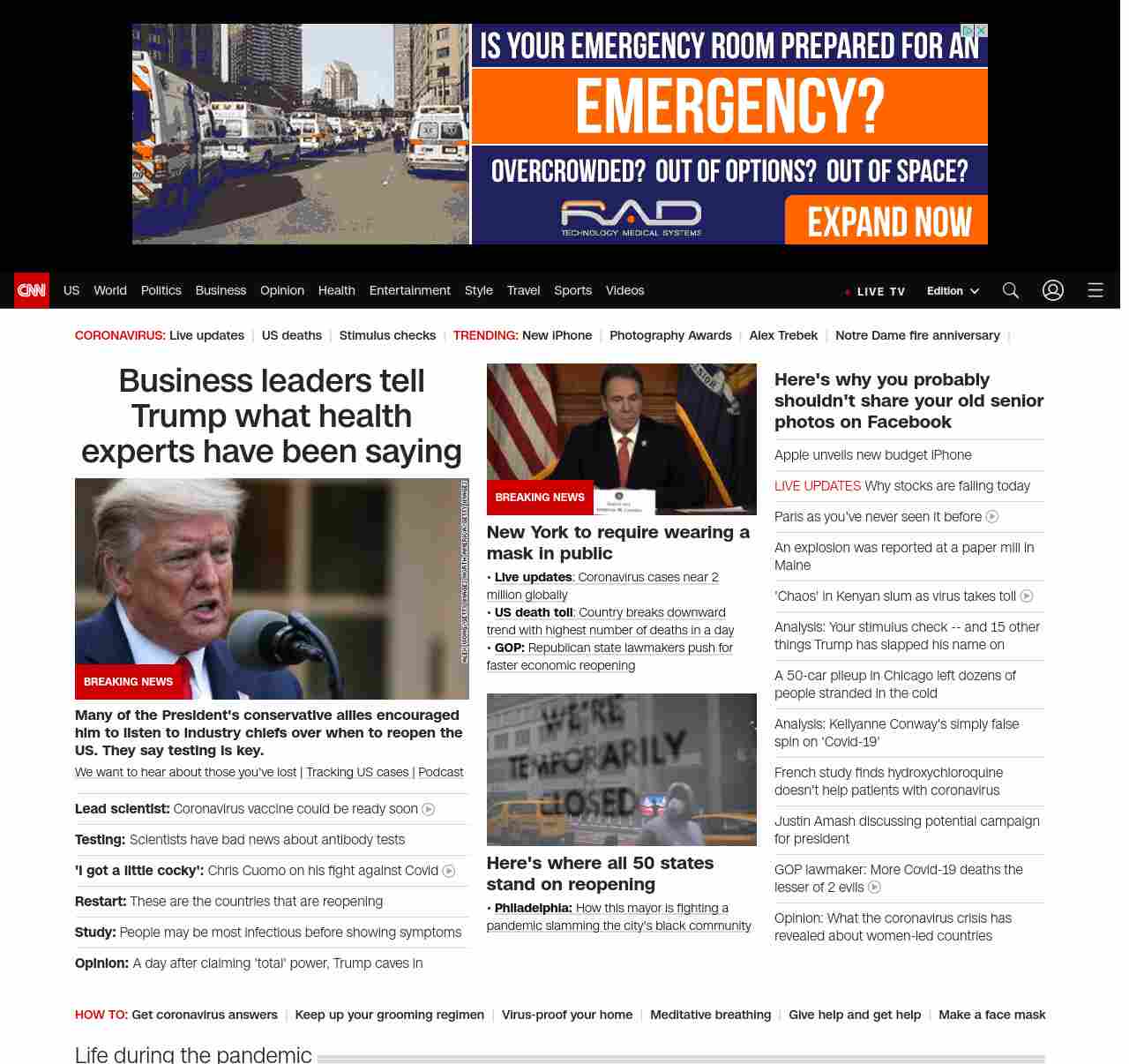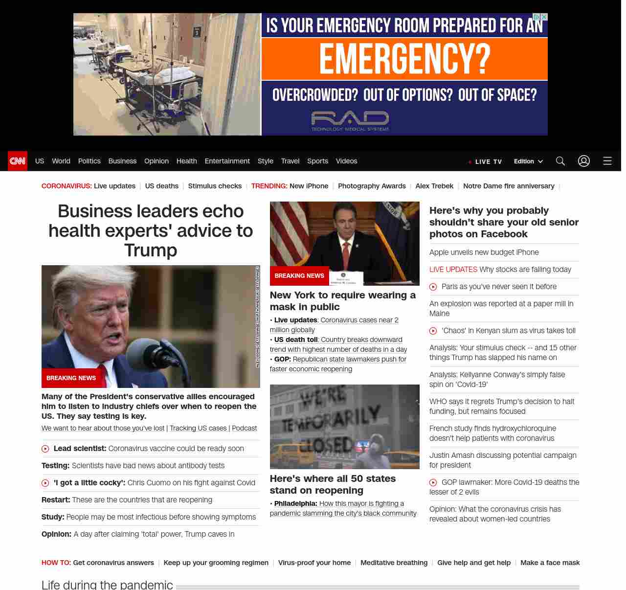 || screaming-banner-text banner-text-size–char-47″ data-analytics=”_list-hierarchical-xs_article_”> Business leaders echo health experts’ advice to Trump ||” , title: “CNN – Breaking News, Latest News and Videos” , siblings: {“articleList”:[{“uri”:”/2020/04/15/politics/trump-business-council-calls/index.html”,”headline”:”u003cstrong>Many of the President’s conservative allies encouraged him to listen to industry chiefs over when to reopen the US. They say testing is key.u003c/strong>”,”thumbnail”:”//cdn.cnn.com/cnnnext/dam/assets/200414235810-donald-trump-april-14-2020-01-small-11.jpg”,”duration”:””,”description”:”u003ca href=”https://www.cnn.com/2020/04/08/health/share-coronavirus-covid19-victims-memories/index.html” target=”_blank”>We want to hear about those you’ve lostu003c/a> | u003ca href=”https://www.cnn.com/interactive/2020/health/coronavirus-us-maps-and-cases/” target=”_blank”>Tracking US cases u003c/a>| u003ca href=”https://www.cnn.com/audio/podcasts/corona-virus”>Podcastu003c/a>”,”layout”:””