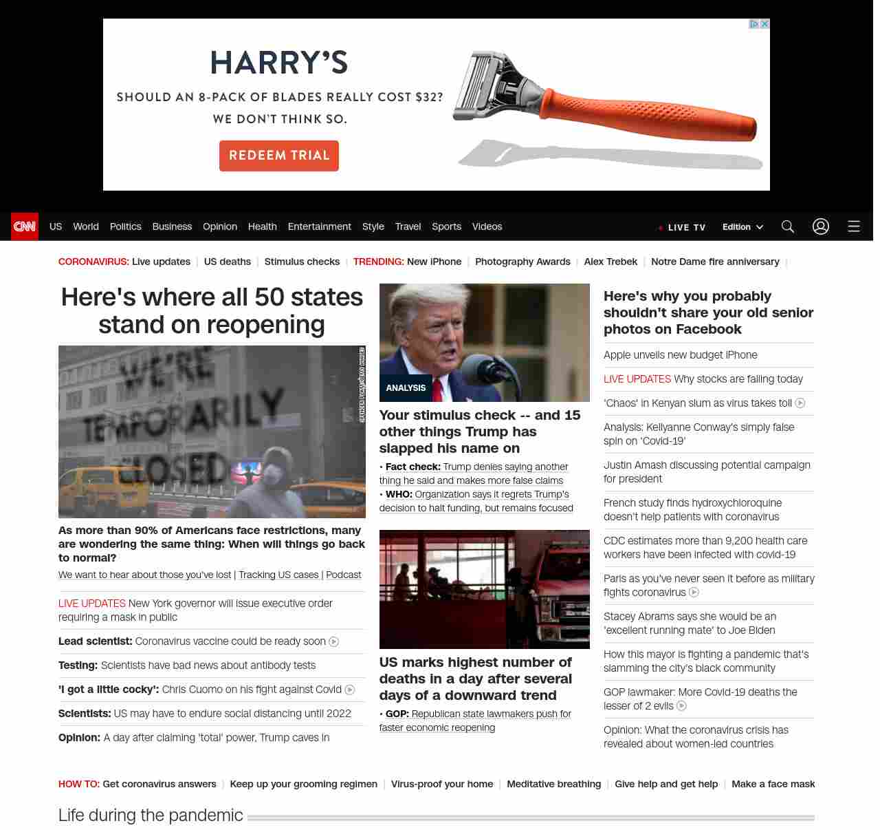 || screaming-banner-text banner-text-size–char-47″ data-analytics=”_list-hierarchical-xs_article_”> Here’s where all 50 states stand on reopening ||” , title: “CNN – Breaking News, Latest News and Videos” , siblings: {“articleList”:[{“uri”:”/2020/04/15/us/states-reopen-coronavirus-trnd/index.html”,”headline”:”u003cstrong>As more than 90% of Americans face restrictions, many are wondering the same thing: When will things go back to normal?u003c/strong>”,”thumbnail”:”//cdn.cnn.com/cnnnext/dam/assets/200415134725-01-closed-sign-manhattan-0310-small-11.jpg”,”duration”:””,”description”:”u003ca href=”https://www.cnn.com/2020/04/08/health/share-coronavirus-covid19-victims-memories/index.html” target=”_blank”>We want to hear about those you’ve lostu003c/a> | u003ca href=”https://www.cnn.com/interactive/2020/health/coronavirus-us-maps-and-cases/” target=”_blank”>Tracking US cases u003c/a>| u003ca href=”https://www.cnn.com/audio/podcasts/corona-virus”>Podcastu003c/a>”,”layout”:””
