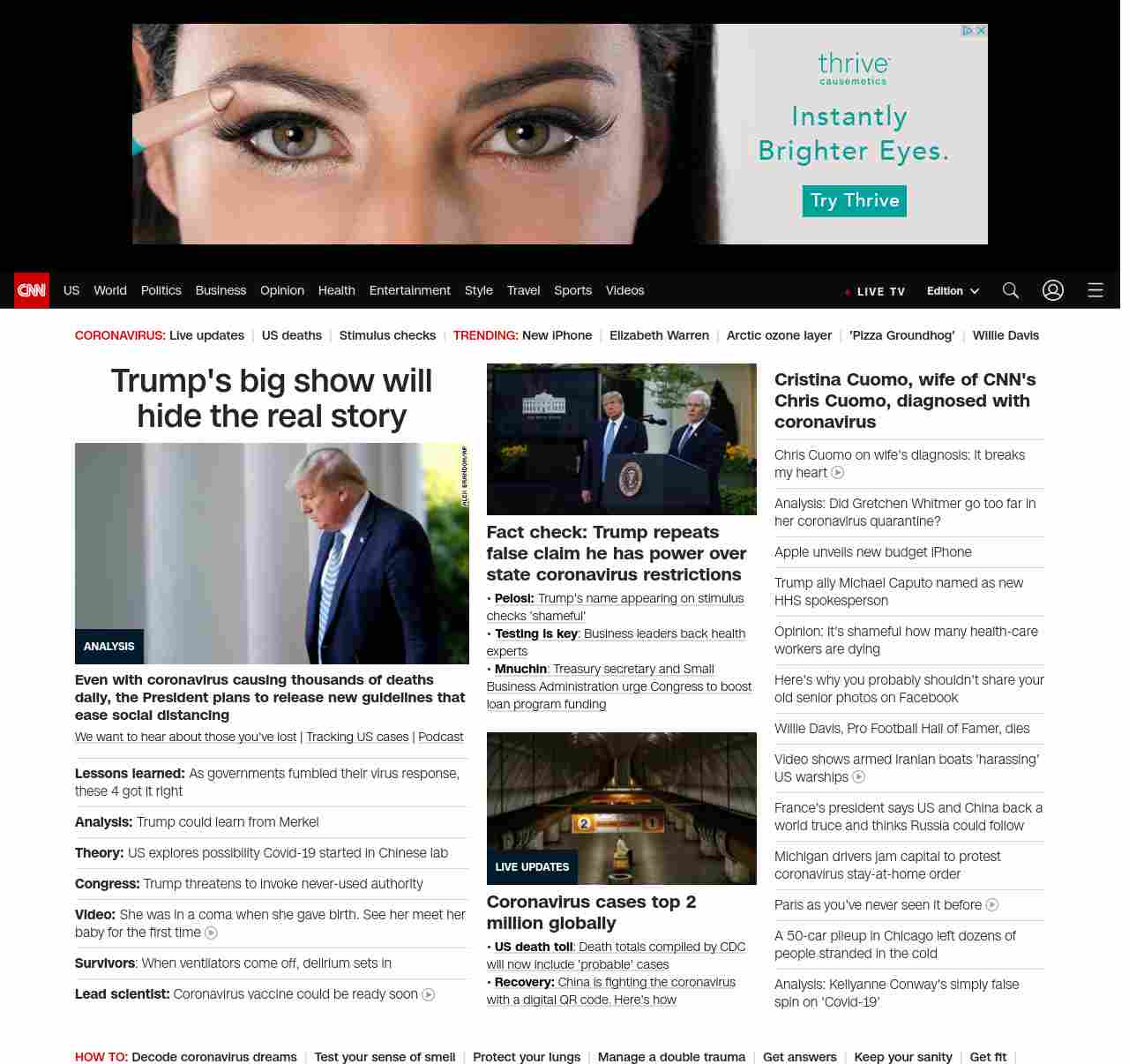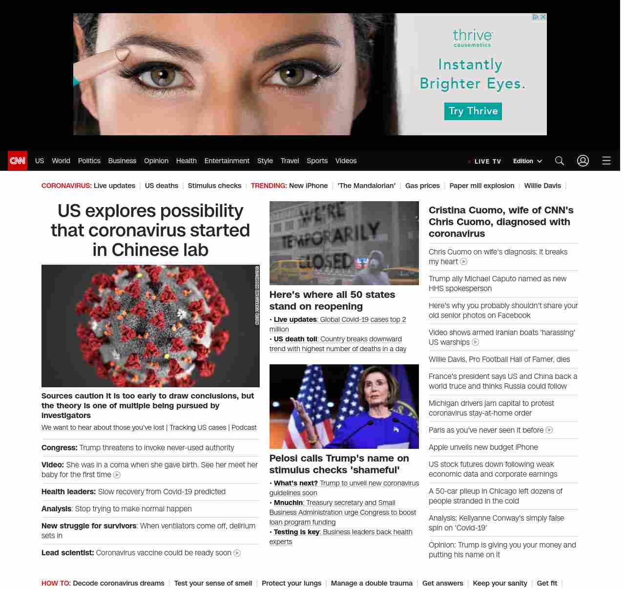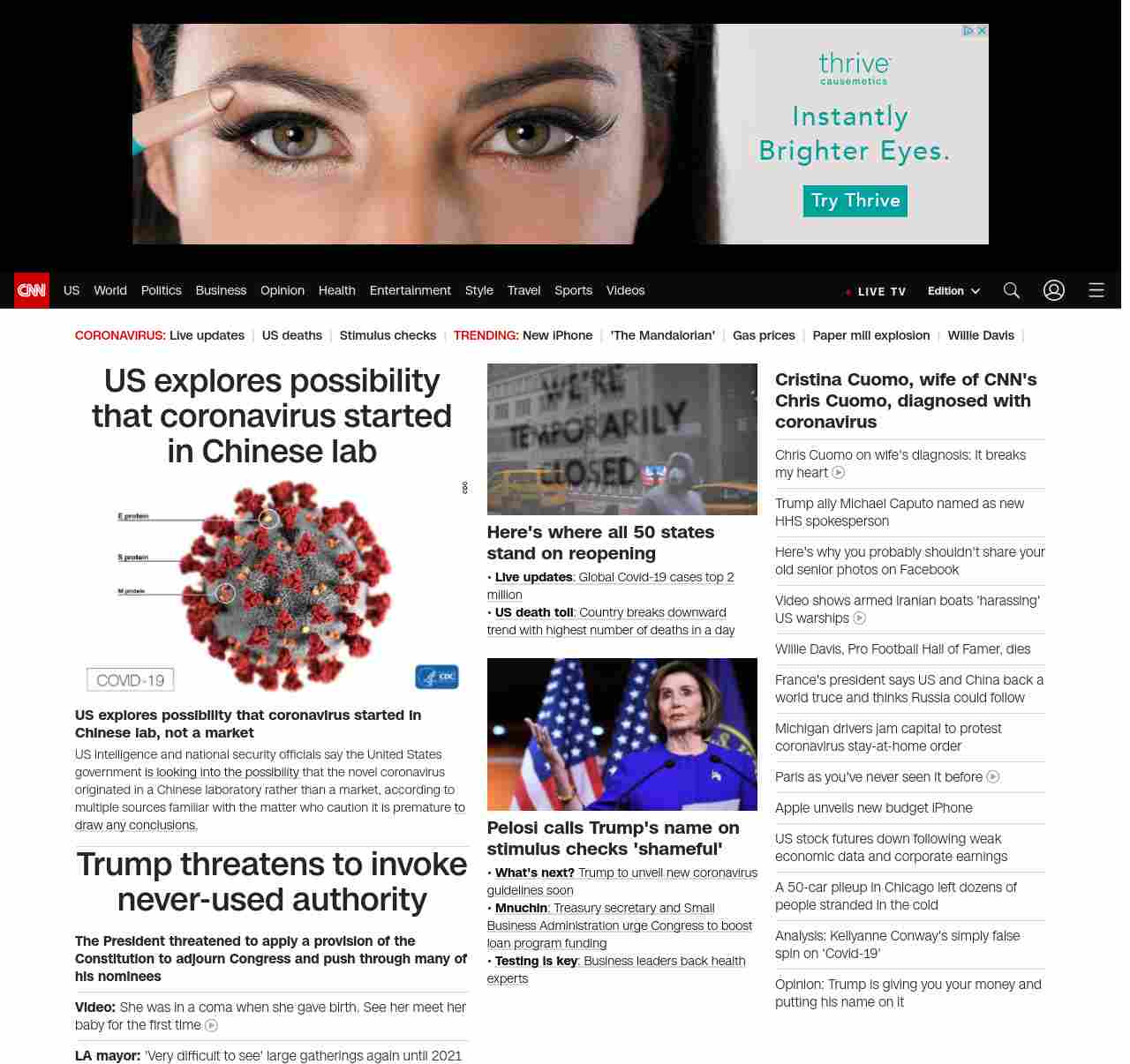 || screaming-banner-text banner-text-size–char-47″ data-analytics=”_list-hierarchical-xs_article_”> US explores possibility that coronavirus started in Chinese lab ||” , title: “CNN – Breaking News, Latest News and Videos” , siblings: {“articleList”:[{“uri”:”/2020/04/16/politics/donald-trump-economy-coronavirus-pain/index.html”,”headline”:”u003cstrong>Even with coronavirus causing thousands of deaths daily, the President plans to release new guidelines that ease social distancing u003c/strong>”,”thumbnail”:”//cdn.cnn.com/cnnnext/dam/assets/200415181452-01-coronavirus-briefing-0415-trump-small-11.jpg”,”duration”:””,”description”:”u003ca href=”https://www.cnn.com/2020/04/08/health/share-coronavirus-covid19-victims-memories/index.html” target=”_blank”>We want to hear about those you’ve lostu003c/a> | u003ca href=”https://www.cnn.com/interactive/2020/health/coronavirus-us-maps-and-cases/” target=”_blank”>Tracking US casesu003c/a> | u003ca href=”https://www.cnn.com/audio/podcasts/corona-virus” target=”_blank”>Podcastu003c/a>”,”layout”:””