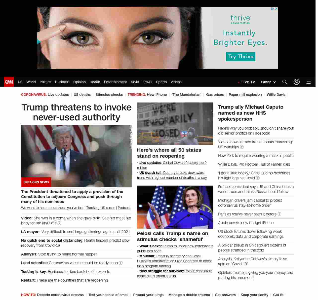 || screaming-banner-text banner-text-size–char-47″ data-analytics=”_list-hierarchical-xs_hyperlink_”> Trump threatens to invoke never-used authority ||” , title: “CNN – Breaking News, Latest News and Videos” , siblings: {“articleList”:[{“uri”:”/videos/health/2020/04/15/mother-reunited-with-newborn-coronavirus-lead-sot-vpx.cnn”,”headline”:”u003cstrong>Video: u003c/strong>She was in a coma when she gave birth. See her meet her baby for the first time”,”thumbnail”:”//cdn.cnn.com/cnnnext/dam/assets/200415172415-yanira-soriano-mom-meets-newborn-coronavirus-coma-small-11.jpg”,”duration”:”01:20″,”description”:”A woman who suffered from severe Covid-19 complications and gave birth while in a medically induced coma met her baby boy for the first time as she left the hospital, surrounded by cheering hospital workers. CNN’s u003ca href=”http://www.cnn.com/profiles/jake-tapper-profile” target=”_blank”>Jake Tapperu003c/a> has more.”,”layout”:””,”iconType”:”video”