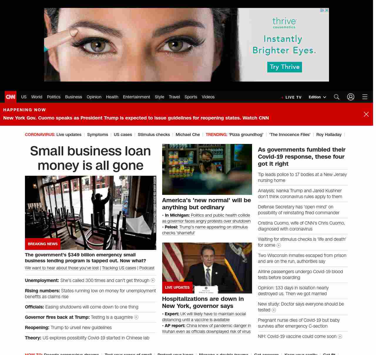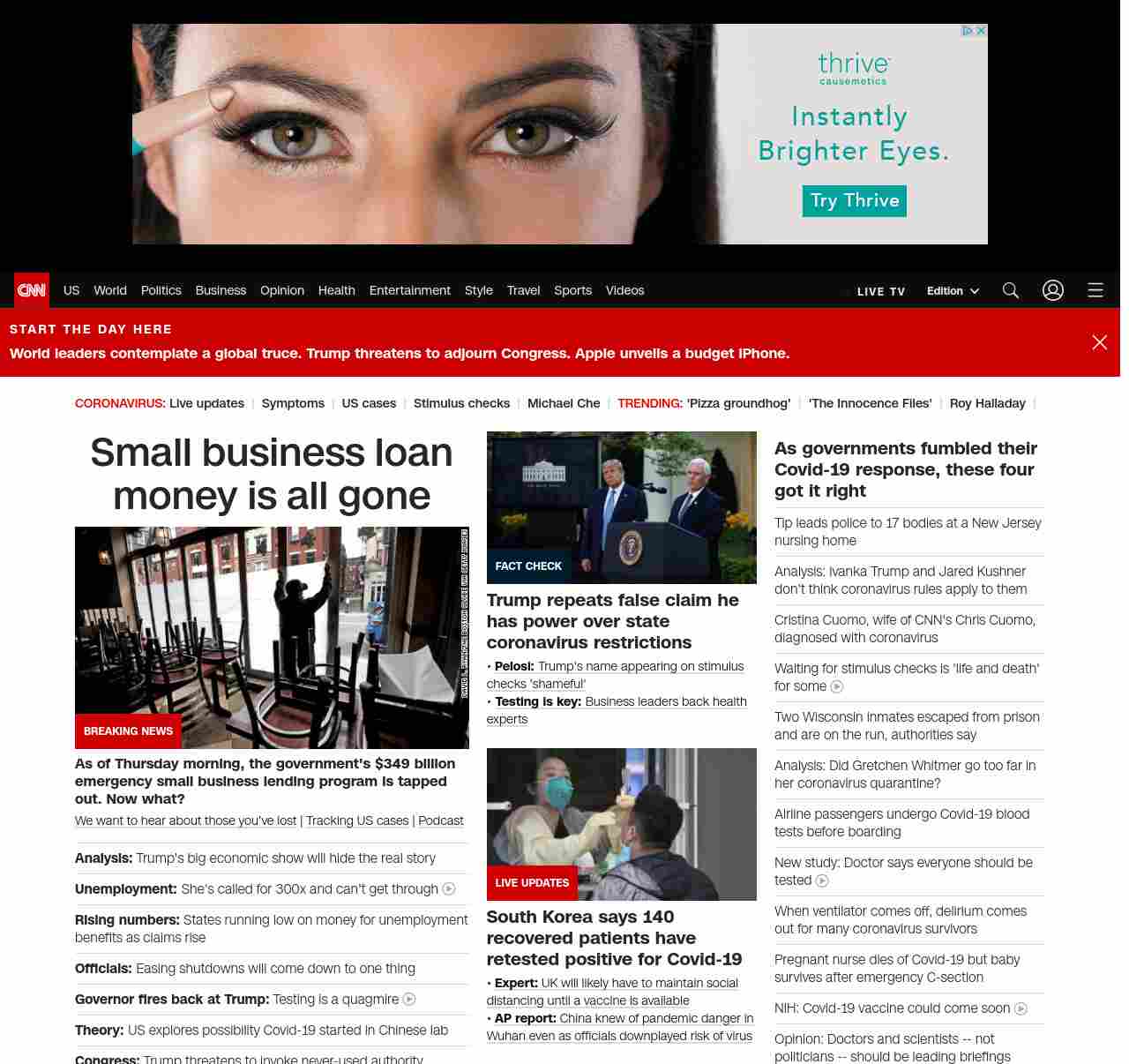 || screaming-banner-text banner-text-size–char-38″ data-analytics=”_list-hierarchical-xs_article_”> Small business loan money is all gone ||” , title: “CNN – Breaking News, Latest News and Videos” , siblings: {“articleList”:[{“uri”:”/2020/04/16/politics/small-business-loan-fight-congress-negotiations/index.html”,”headline”:”u003cstrong>As of Thursday morning, the government’s $349 billion emergency small business lending program is tapped out. Now what?u003c/strong>”,”thumbnail”:”//cdn.cnn.com/cnnnext/dam/assets/200303105041-steve-mnuchin-0212-small-11.jpg”,”duration”:””,”description”:”u003ca href=”https://www.cnn.com/2020/04/08/health/share-coronavirus-covid19-victims-memories/index.html” target=”_blank”>We want to hear about those you’ve lostu003c/a> | u003ca href=”https://www.cnn.com/interactive/2020/health/coronavirus-us-maps-and-cases/” target=”_blank”>Tracking US casesu003c/a> | u003ca href=”https://www.cnn.com/audio/podcasts/corona-virus” target=”_blank”>Podcastu003c/a>”,”layout”:””