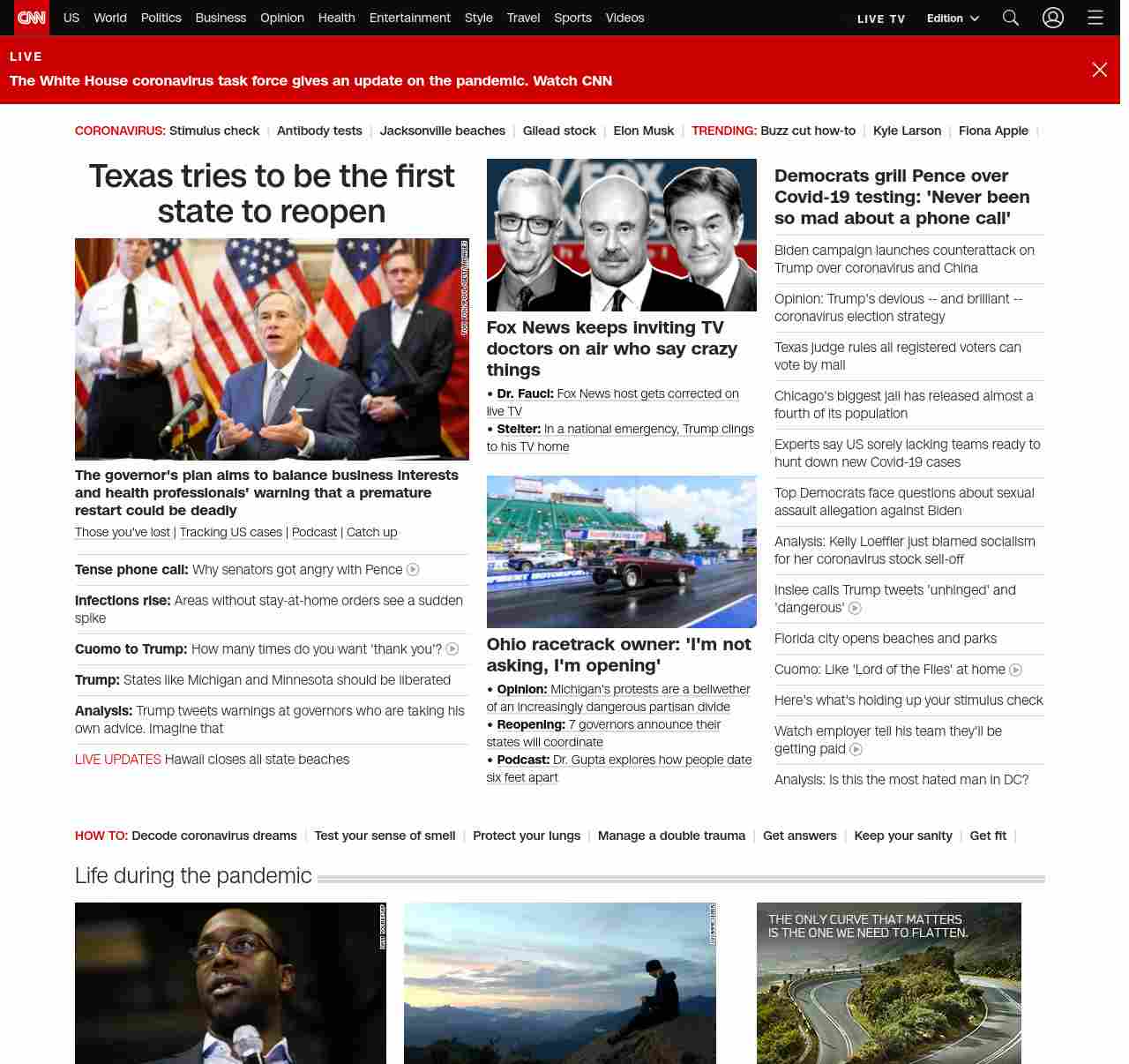 || screaming-banner-text banner-text-size–char-44″ data-analytics=”_list-hierarchical-xs_article_”> Texas tries to be the first state to reopen ||” , title: “CNN – Breaking News, Latest News and Videos” , siblings: {“articleList”:[{“uri”:”/2020/04/17/politics/texas-economy-reopen-testing-coronavirus/index.html”,”headline”:”u003cstrong>The governor’s plan aims to balance businesss interests and health professionals’ warning that a premature restart could be deadlyu003c/strong>”,”thumbnail”:”//cdn.cnn.com/cnnnext/dam/assets/200417123050-01-gov-abbott-0329-small-11.jpg”,”duration”:””,”description”:”u003ca href=”https://www.cnn.com/2020/04/08/health/share-coronavirus-covid19-victims-memories/index.html” target=”_blank”>Those you’ve lost u003c/a>| u003ca href=”https://www.cnn.com/interactive/2020/health/coronavirus-us-maps-and-cases/” target=”_blank”>Tracking US casesu003c/a> | u003ca href=”https://www.cnn.com/audio/podcasts/corona-virus” target=”_blank”>Podcastu003c/a> | u003ca href=”https://www.cnn.com/2020/04/17/world/coronavirus-newsletter-04-17-20-intl/index.html” target=”_blank”>Catch up u003c/a>”,”layout”:””