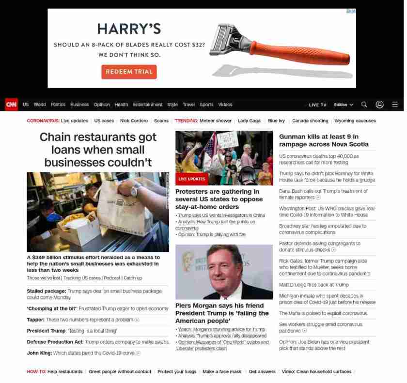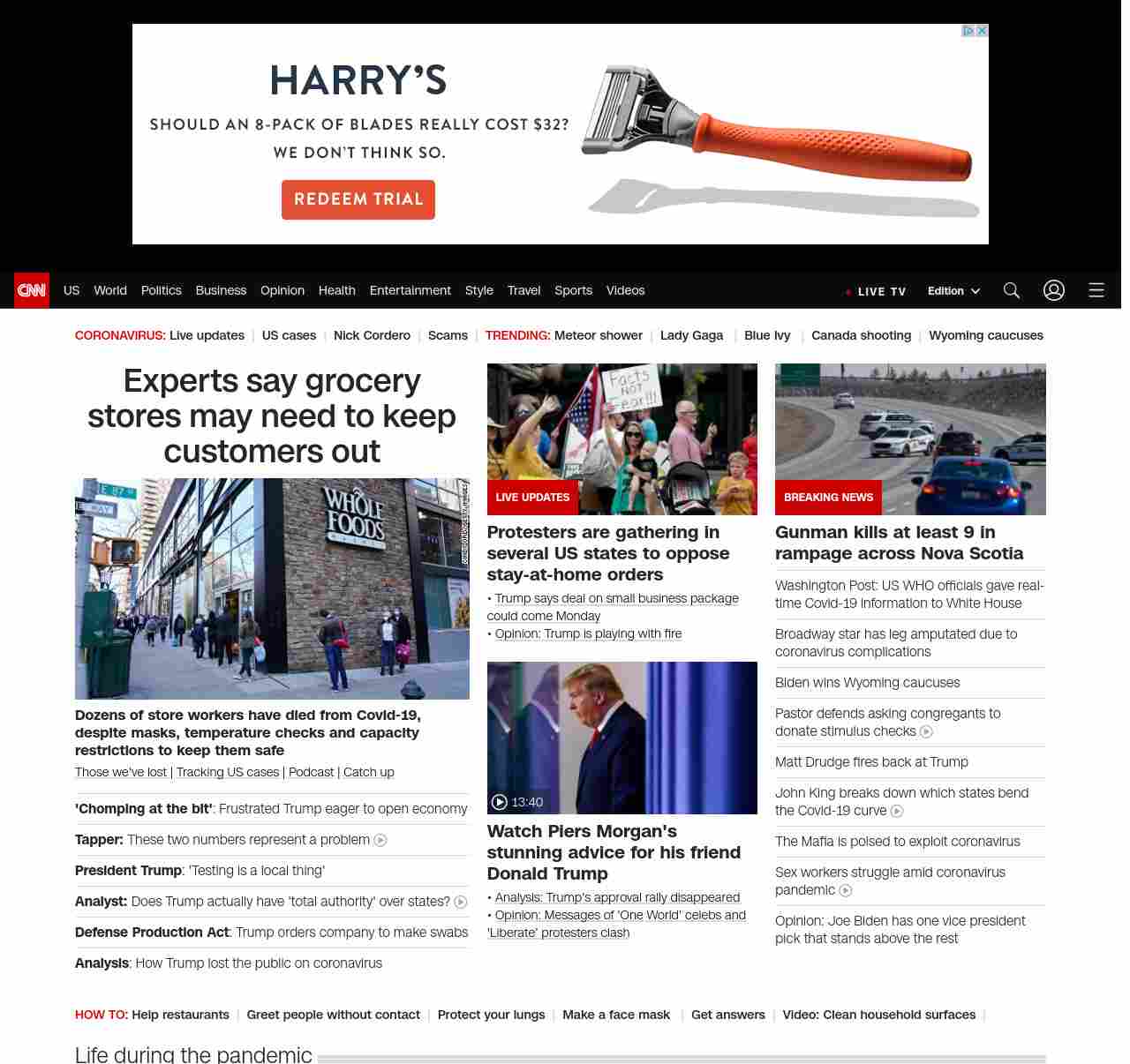 || screaming-banner-text banner-text-size–char-47″ data-analytics=”_list-hierarchical-xs_article_”> Experts say grocery stores may need to keep customers out ||” , title: “CNN – Breaking News, Latest News and Videos” , siblings: {“articleList”:[{“uri”:”/2020/04/19/business/small-businesses-ppp-loans-chain-restaurants/index.html”,”headline”:”u003cstrong>A $349 billion stimulus effort heralded as a means to help the nation’s small businesses was exhausted in less than two weeksu003c/strong>”,”thumbnail”:”//cdn.cnn.com/cnnnext/dam/assets/200418120642-01-shake-shack-file-small-11.jpg”,”duration”:””,”description”:”u003ca href=”https://www.cnn.com/interactive/2020/health/coronavirus-victims-memories/” target=”_blank”>Those we’ve lost u003c/a>| u003ca href=”https://www.cnn.com/interactive/2020/health/coronavirus-us-maps-and-cases/” target=”_blank”>Tracking US casesu003c/a> | u003ca href=”https://www.cnn.com/audio/podcasts/corona-virus” target=”_blank”>Podcastu003c/a> | u003ca href=”https://www.cnn.com/2020/04/19/world/coronavirus-newsletter-04-19-20/index.html” target=”_blank”>Catch up u003c/a>”,”layout”:””