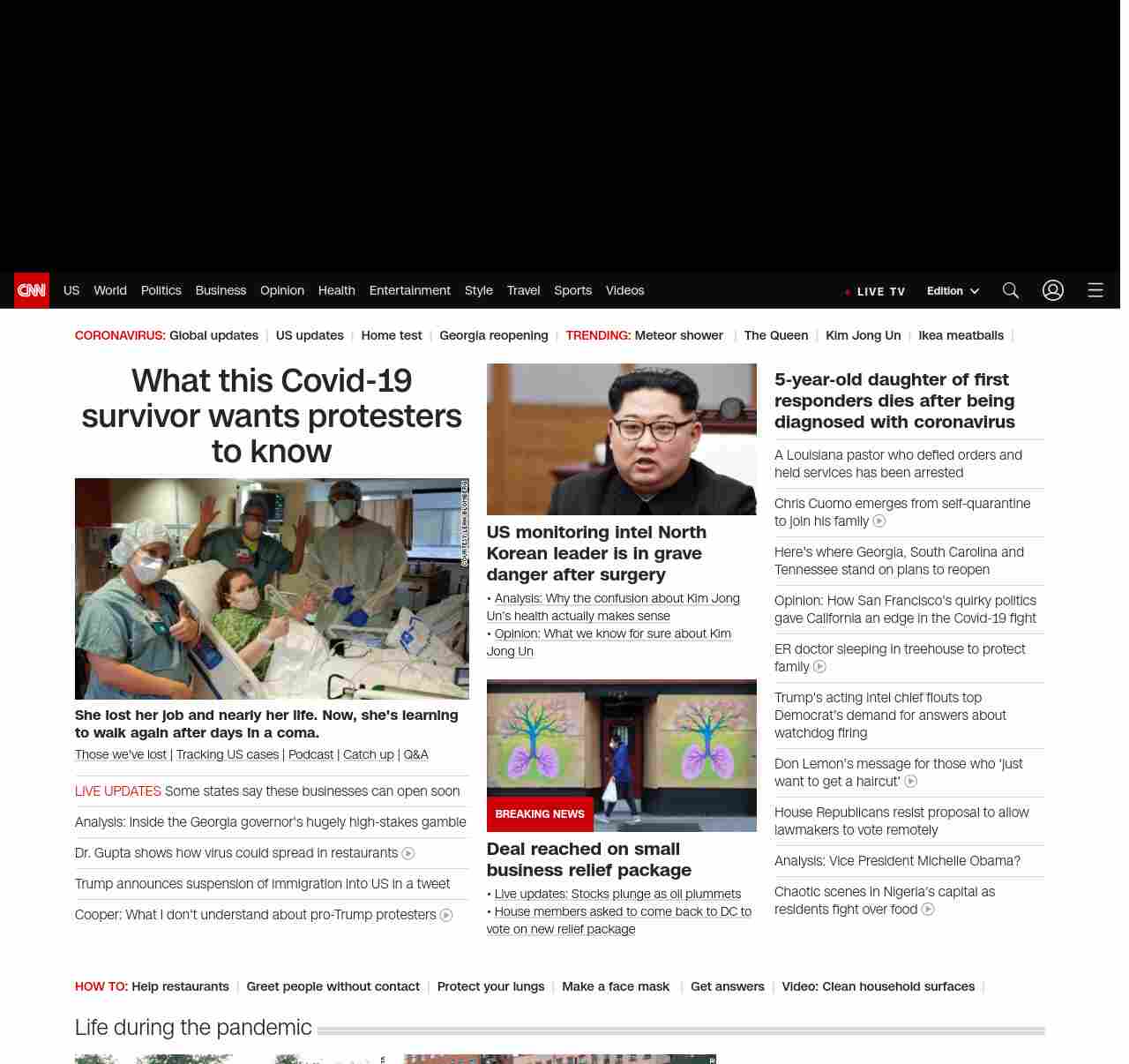 || screaming-banner-text banner-text-size–char-47″ data-analytics=”_list-hierarchical-xs_article_”> What this Covid-19 survivor wants protesters to know ||” , title: “CNN – Breaking News, Latest News and Videos” , siblings: {“articleList”:[{“uri”:”/2020/04/21/us/coronavirus-survivor-response-to-protesters/index.html”,”headline”:”u003cstrong>She lost her job and nearly her life. Now, she’s learning to walk again after days in a coma.u003c/strong>”,”thumbnail”:”//cdn.cnn.com/cnnnext/dam/assets/200421023256-02-leah-blomberg-small-11.jpg”,”duration”:””,”description”:”u003ca href=”https://www.cnn.com/interactive/2020/health/coronavirus-victims-memories/” target=”_blank”>Those we’ve lost u003c/a>| u003ca href=”https://www.cnn.com/interactive/2020/health/coronavirus-us-maps-and-cases/” target=”_blank”>Tracking US casesu003c/a> | u003ca href=”https://www.cnn.com/audio/podcasts/corona-virus” target=”_blank”>Podcastu003c/a> | u003ca href=”https://www.cnn.com/2020/04/20/world/coronavirus-newsletter-04-20-20-intl/index.html” target=”_blank”>Catch upu003c/a> | u003ca href=”http://cnn.com/CoronavirusAnswers” target=”_blank”>Q&Au003c/a>”,”layout”:””