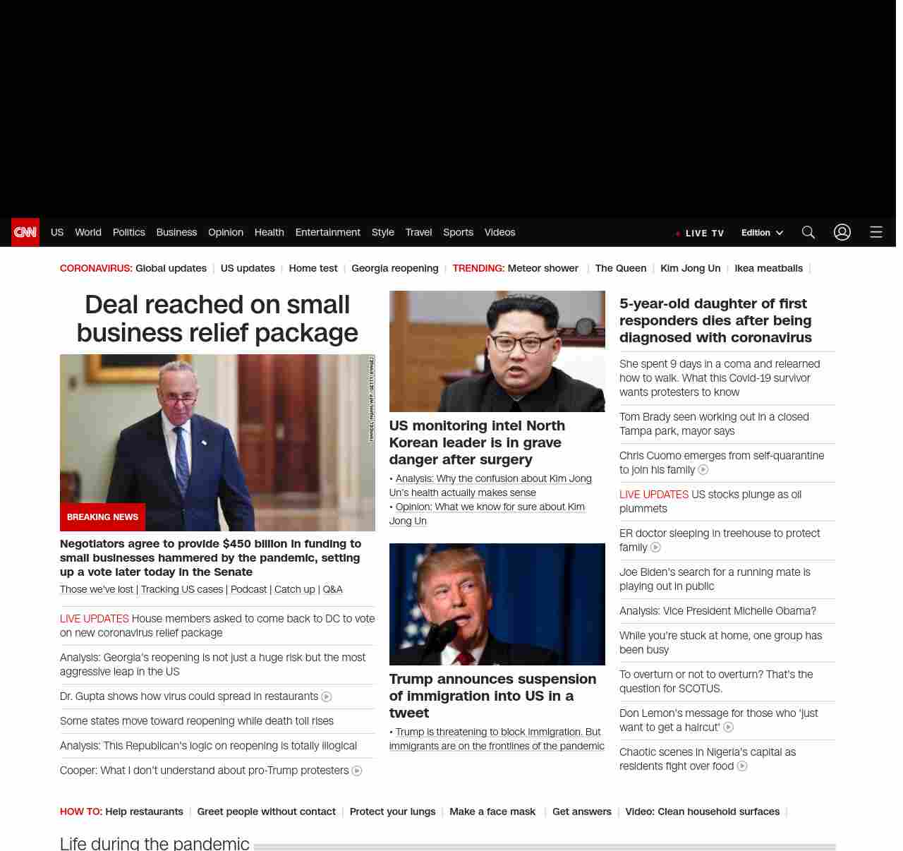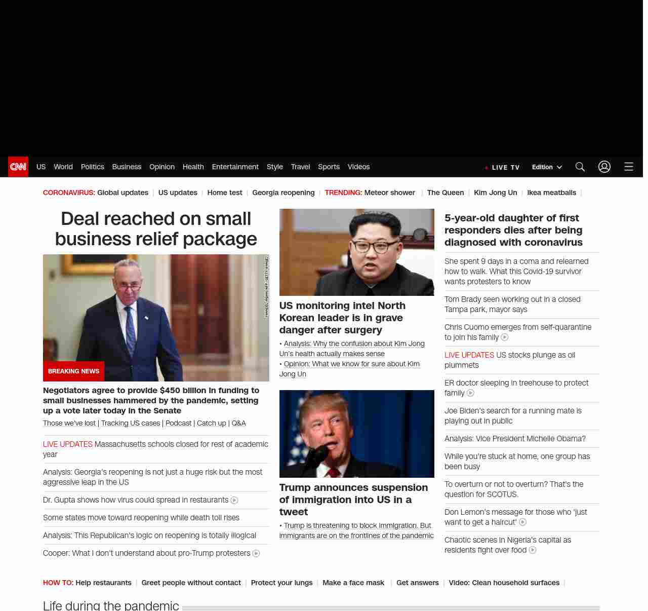 || screaming-banner-text banner-text-size–char-47″ data-analytics=”_list-hierarchical-xs_article_”> Deal reached on small business relief package ||” , title: “CNN – Breaking News, Latest News and Videos” , siblings: {“articleList”:[{“uri”:”/2020/04/21/politics/chuck-schumer-coronavirus-relief-small-business-cnntv/index.html”,”headline”:”u003cstrong>Negotiators agree to provide $450 billion in funding to small businesses hammered by the pandemic, setting up a vote later today in the Senateu003c/strong>”,”thumbnail”:”//cdn.cnn.com/cnnnext/dam/assets/200421115136-seattle-pedestrian-closed-business-0414-small-11.jpg”,”duration”:””,”description”:”u003ca href=”https://www.cnn.com/interactive/2020/health/coronavirus-victims-memories/” target=”_blank”>Those we’ve lost u003c/a>| u003ca href=”https://www.cnn.com/interactive/2020/health/coronavirus-us-maps-and-cases/” target=”_blank”>Tracking US casesu003c/a> | u003ca href=”https://www.cnn.com/audio/podcasts/corona-virus” target=”_blank”>Podcastu003c/a> | u003ca href=”https://www.cnn.com/2020/04/20/world/coronavirus-newsletter-04-20-20-intl/index.html” target=”_blank”>Catch upu003c/a> | u003ca href=”http://cnn.com/CoronavirusAnswers” target=”_blank”>Q&Au003c/a>”,”layout”:””