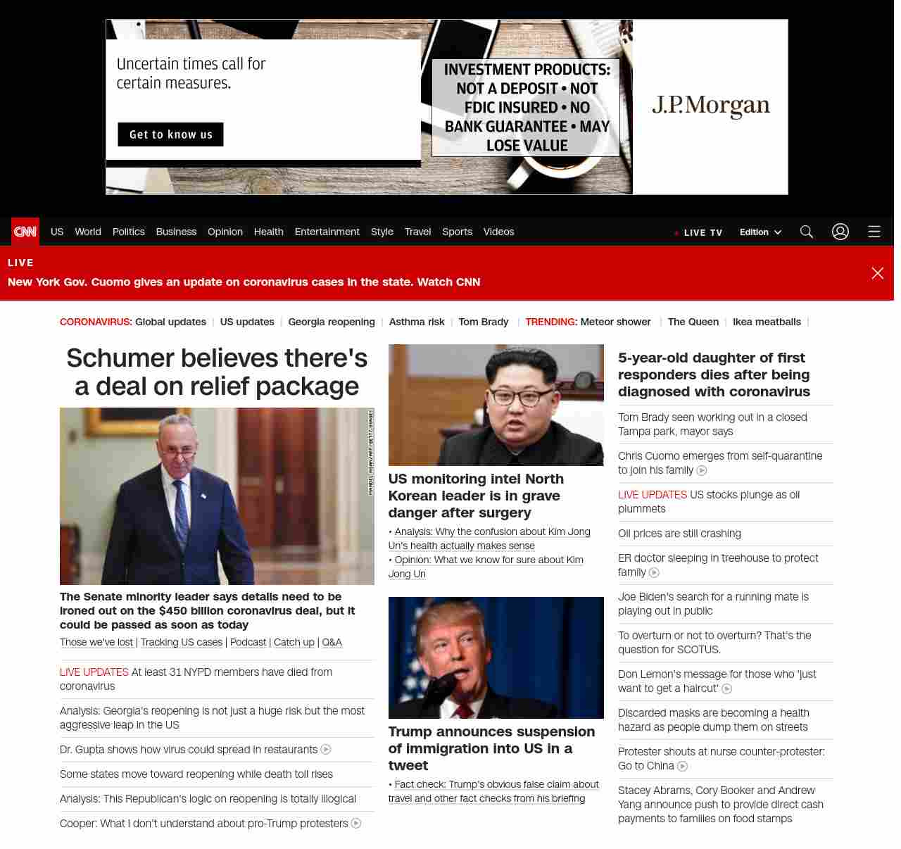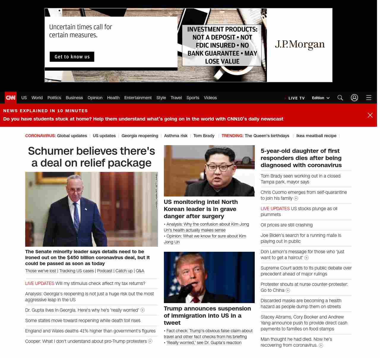 || screaming-banner-text banner-text-size–char-47″ data-analytics=”_list-hierarchical-xs_article_”> Schumer believes there’s a deal on relief package ||” , title: “CNN – Breaking News, Latest News and Videos” , siblings: {“articleList”:[{“uri”:”/2020/04/21/politics/chuck-schumer-coronavirus-relief-small-business-cnntv/index.html”,”headline”:”u003cstrong>The Senate minority leader says details need to be ironed out on the $450 billion coronavirus deal, but it could be passed as soon as today u003c/strong>”,”thumbnail”:”//cdn.cnn.com/cnnnext/dam/assets/200103132119-01-chuck-schumer-capitol-1203-small-11.jpg”,”duration”:””,”description”:”u003ca href=”https://www.cnn.com/interactive/2020/health/coronavirus-victims-memories/” target=”_blank”>Those we’ve lost u003c/a>| u003ca href=”https://www.cnn.com/interactive/2020/health/coronavirus-us-maps-and-cases/” target=”_blank”>Tracking US casesu003c/a> | u003ca href=”https://www.cnn.com/audio/podcasts/corona-virus” target=”_blank”>Podcastu003c/a> | u003ca href=”https://www.cnn.com/2020/04/20/world/coronavirus-newsletter-04-20-20-intl/index.html” target=”_blank”>Catch upu003c/a> | u003ca href=”http://cnn.com/CoronavirusAnswers” target=”_blank”>Q&Au003c/a>”,”layout”:””