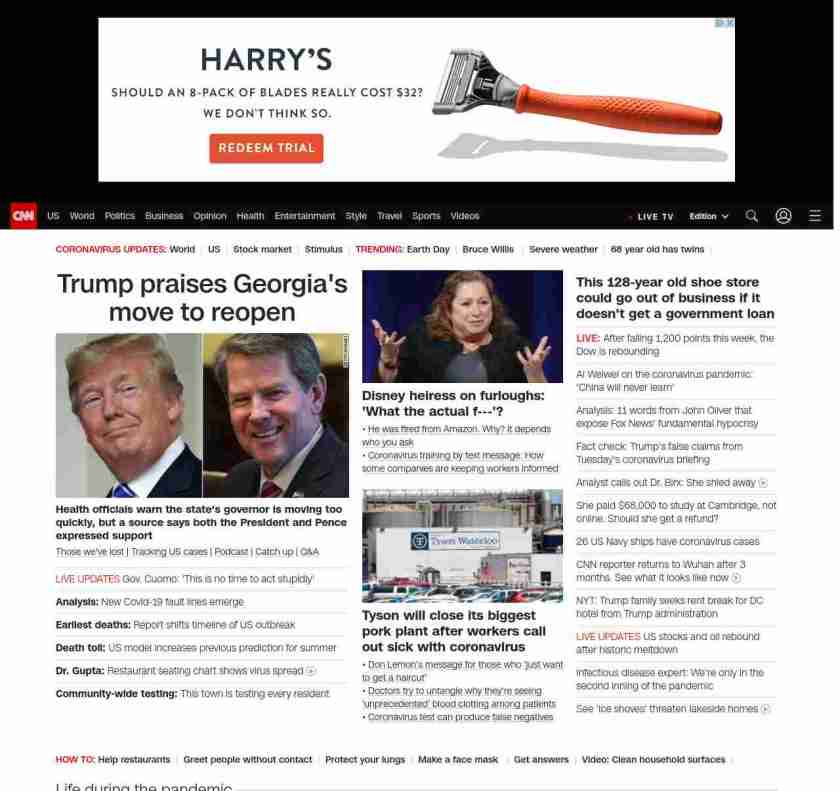 || screaming-banner-text banner-text-size–char-32″ data-analytics=”_list-hierarchical-xs_article_”> New Covid-19 fault lines emerge ||” , title: “CNN – Breaking News, Latest News and Videos” , siblings: {“articleList”:[{“uri”:”/2020/04/22/politics/trump-pence-georgia-governor-brian-kemp/index.html”,”headline”:”Health officials warn the state’s governor is moving too quickly, but a source says both the President and Pence expressed support”,”thumbnail”:”//cdn.cnn.com/cnnnext/dam/assets/200422123738-trump-kemp-split-small-11.jpg”,”duration”:””,”description”:” u003ca href=”https://www.cnn.com/interactive/2020/health/coronavirus-victims-memories/” target=”_blank”>Those we’ve lost u003c/a>| u003ca href=”https://www.cnn.com/interactive/2020/health/coronavirus-us-maps-and-cases/” target=”_blank”>Tracking US casesu003c/a> | u003ca href=”https://www.cnn.com/audio/podcasts/corona-virus” target=”_blank”>Podcastu003c/a> | u003ca href=”http://www.cnn.com/2020/04/22/world/coronavirus-newsletter-04-22-20-intl/index.html” target=”_blank”>Catch upu003c/a> | u003ca href=”http://cnn.com/CoronavirusAnswers” target=”_blank”>Q&Au003c/a>”,”layout”:””