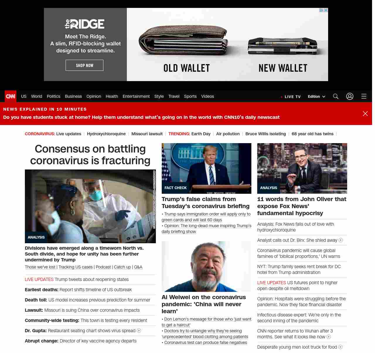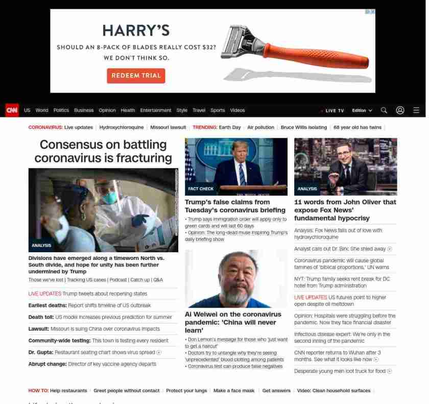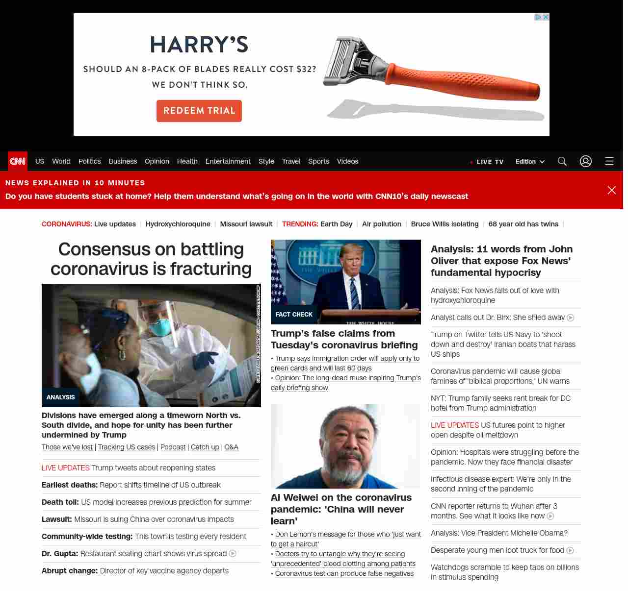 || screaming-banner-text banner-text-size–char-47″ data-analytics=”_list-hierarchical-xs_article_”> Consensus on battling coronavirus is fracturing ||” , title: “CNN – Breaking News, Latest News and Videos” , siblings: {“articleList”:[{“uri”:”/2020/04/22/politics/donald-trump-coronavirus-economy/index.html”,”headline”:”u003cstrong>Divisions have emerged along a timeworn North vs. South divide, and hope for unity has been further undermined by Trumpu003c/strong>”,”thumbnail”:”//cdn.cnn.com/cnnnext/dam/assets/200421231144-03-georgia-lockdwon-small-11.jpg”,”duration”:””,”description”:” u003ca href=”https://www.cnn.com/interactive/2020/health/coronavirus-victims-memories/” target=”_blank”>Those we’ve lost u003c/a>| u003ca href=”https://www.cnn.com/interactive/2020/health/coronavirus-us-maps-and-cases/” target=”_blank”>Tracking US casesu003c/a> | u003ca href=”https://www.cnn.com/audio/podcasts/corona-virus” target=”_blank”>Podcastu003c/a> | u003ca href=”https://www.cnn.com/2020/04/20/world/coronavirus-newsletter-04-20-20-intl/index.html” target=”_blank”>Catch upu003c/a> | u003ca href=”http://cnn.com/CoronavirusAnswers” target=”_blank”>Q&Au003c/a>”,”layout”:””