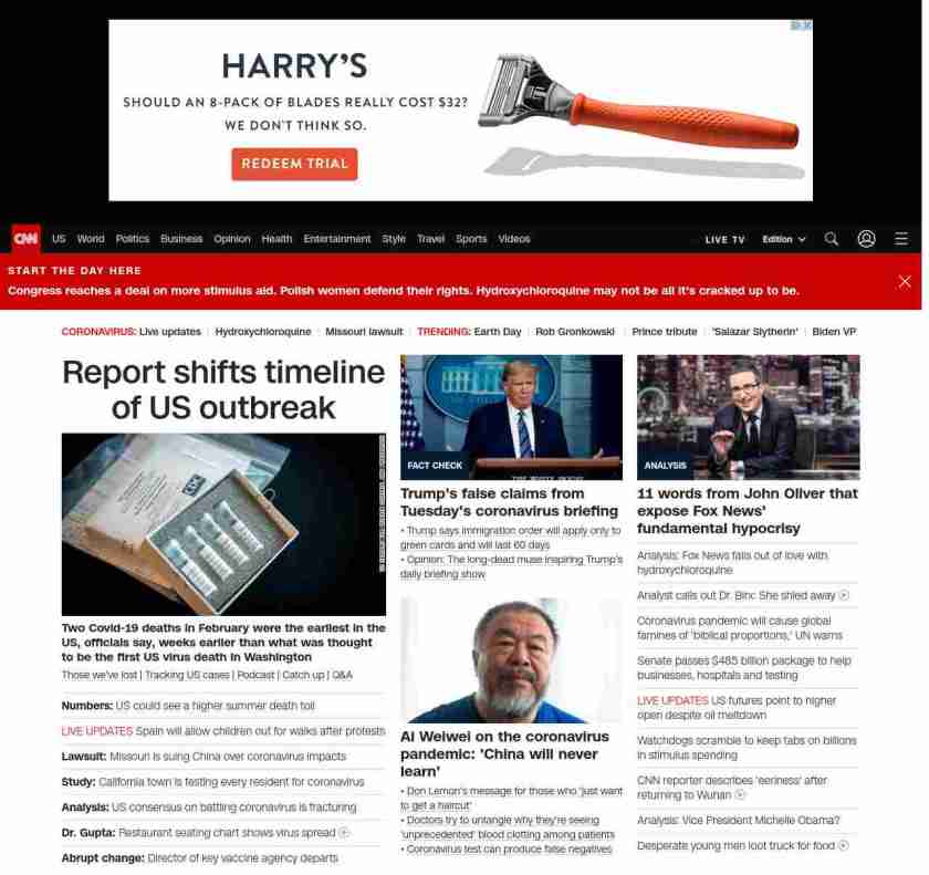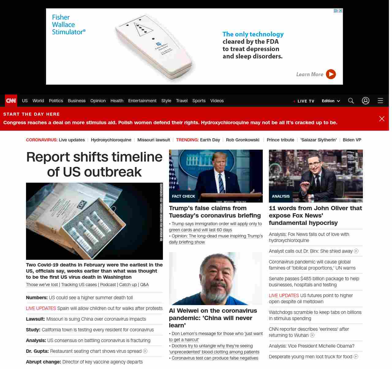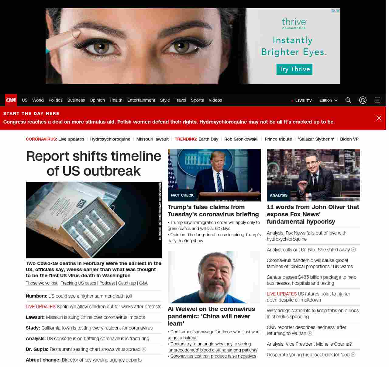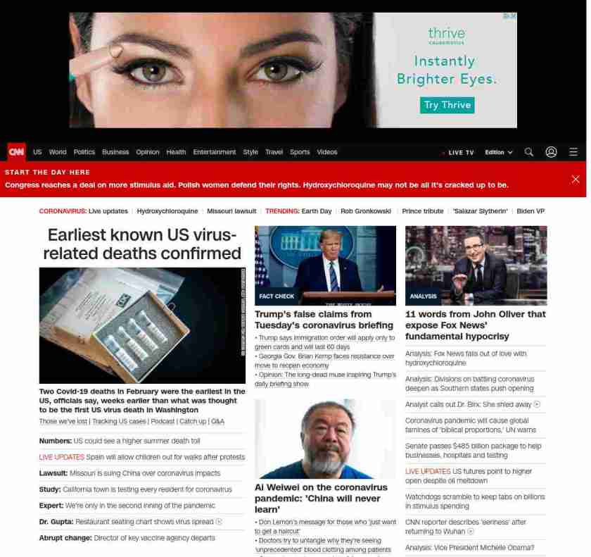 || screaming-banner-text banner-text-size–char-38″ data-analytics=”_list-hierarchical-xs_article_”> Report shifts timeline of US outbreak ||” , title: “CNN – Breaking News, Latest News and Videos” , siblings: {“articleList”:[{“uri”:”/2020/04/22/us/california-deaths-earliest-in-us/index.html”,”headline”:”u003cstrong>Two Covid-19 deaths u003c/strong>u003cstrong>in February were the earliest in the US, officials say, weeks earlier than what was thought to be the first US virus death in Washingtonu003c/strong>”,”thumbnail”:”//cdn.cnn.com/cnnnext/dam/assets/200205145513-us-centers-for-disease-control-and-prevention-coronavirus-test-kit-small-11.jpg”,”duration”:””,”description”:” u003ca href=”https://www.cnn.com/interactive/2020/health/coronavirus-victims-memories/” target=”_blank”>Those we’ve lost u003c/a>| u003ca href=”https://www.cnn.com/interactive/2020/health/coronavirus-us-maps-and-cases/” target=”_blank”>Tracking US casesu003c/a> | u003ca href=”https://www.cnn.com/audio/podcasts/corona-virus” target=”_blank”>Podcastu003c/a> | u003ca href=”https://www.cnn.com/2020/04/22/world/coronavirus-newsletter-04-22-20-intl/index.html” target=”_blank”>Catch upu003c/a> | u003ca href=”http://cnn.com/CoronavirusAnswers” target=”_blank”>Q&Au003c/a>”,”layout”:””