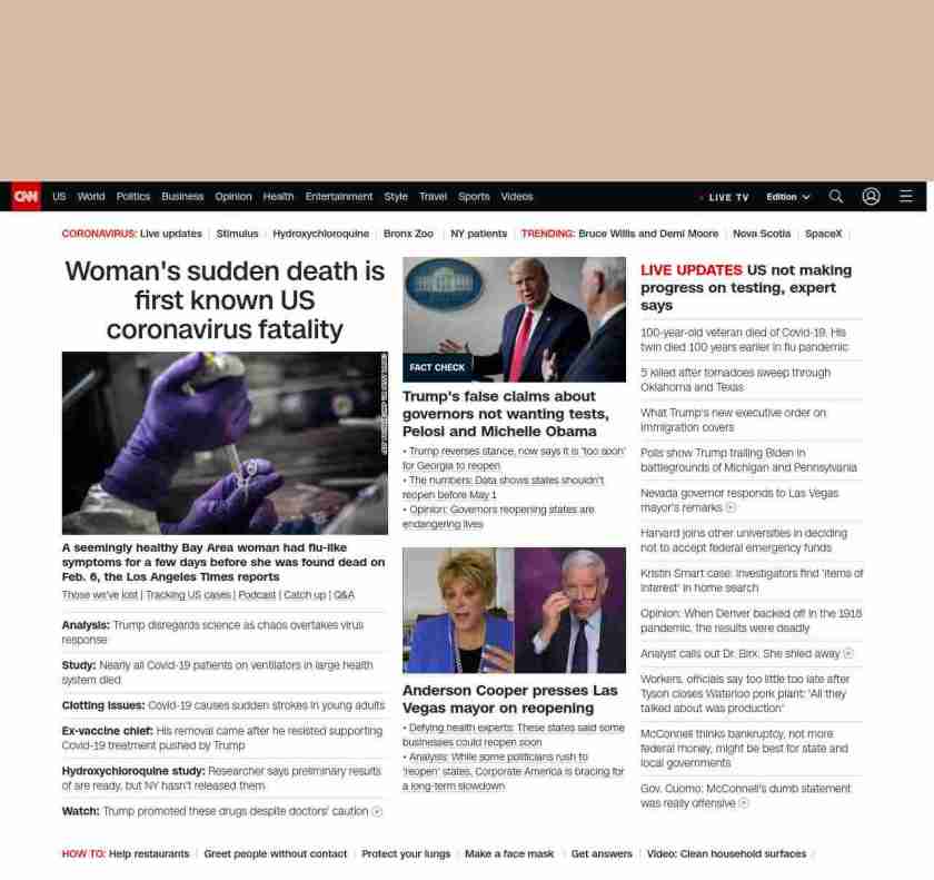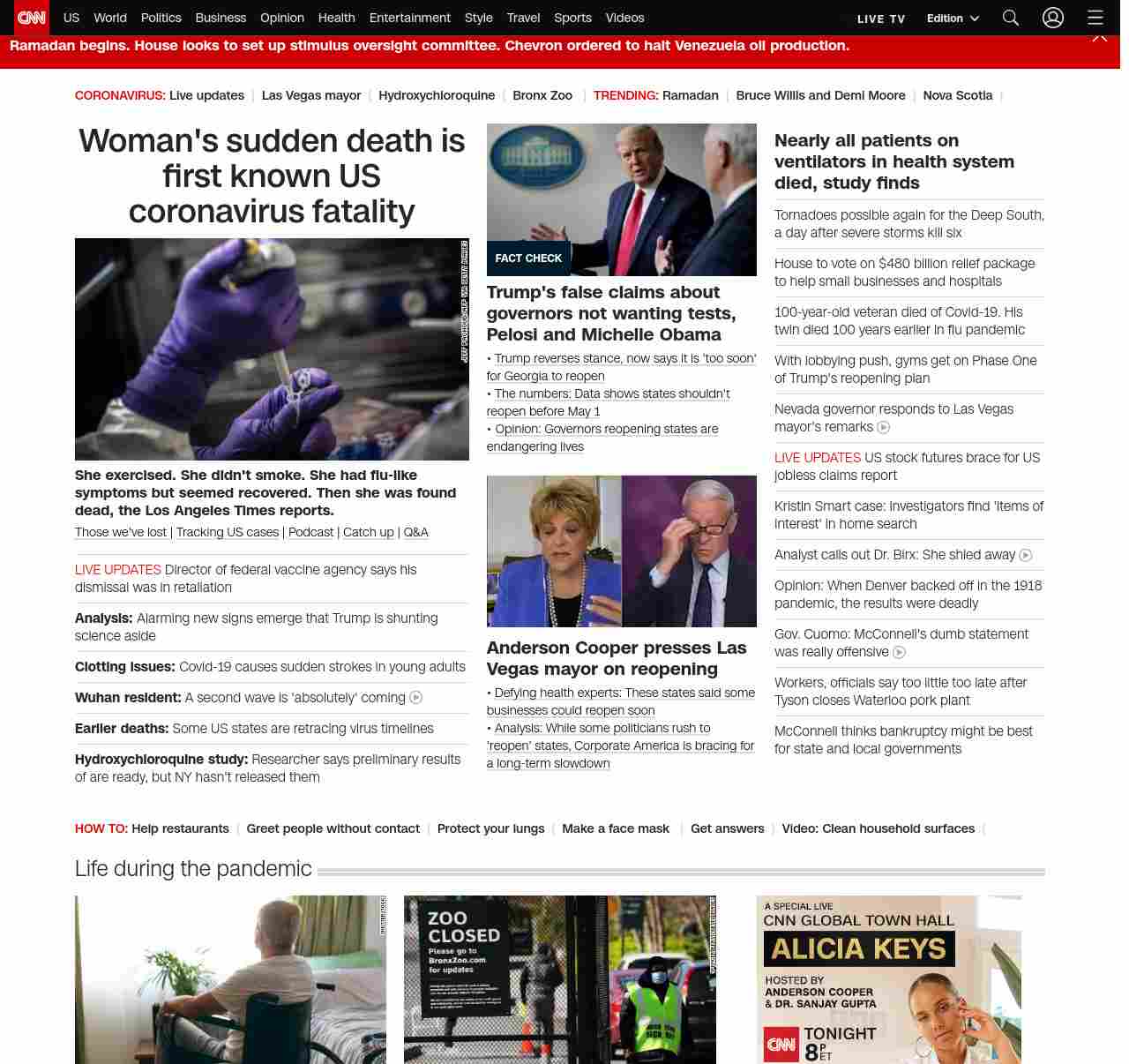 || screaming-banner-text banner-text-size–char-47″ data-analytics=”_list-hierarchical-xs_article_”> Trump disregards science as chaos overtakes virus response ||” , title: “CNN – Breaking News, Latest News and Videos” , siblings: {“articleList”:[{“uri”:”/2020/04/23/us/california-woman-first-coronavirus-death/index.html”,”headline”:”u003cstrong>A seemingly healthy Bay Area woman had flu-like symptoms for a few days before she was found dead on Feb. 6, the Los Angeles Times reportsu003c/strong>”,”thumbnail”:”//cdn.cnn.com/cnnnext/dam/assets/200228111204-01-coronavirus-treatment-testing-0205-small-11.jpg”,”duration”:””,”description”:” u003ca href=”https://www.cnn.com/interactive/2020/health/coronavirus-victims-memories/” target=”_blank”>Those we’ve lost u003c/a>| u003ca href=”https://www.cnn.com/interactive/2020/health/coronavirus-us-maps-and-cases/” target=”_blank”>Tracking US casesu003c/a> | u003ca href=”https://www.cnn.com/audio/podcasts/corona-virus” target=”_blank”>Podcastu003c/a> | u003ca href=”http://www.cnn.com/2020/04/22/world/coronavirus-newsletter-04-22-20-intl/index.html” target=”_blank”>Catch upu003c/a> | u003ca href=”http://cnn.com/CoronavirusAnswers” target=”_blank”>Q&Au003c/a>”,”layout”:””