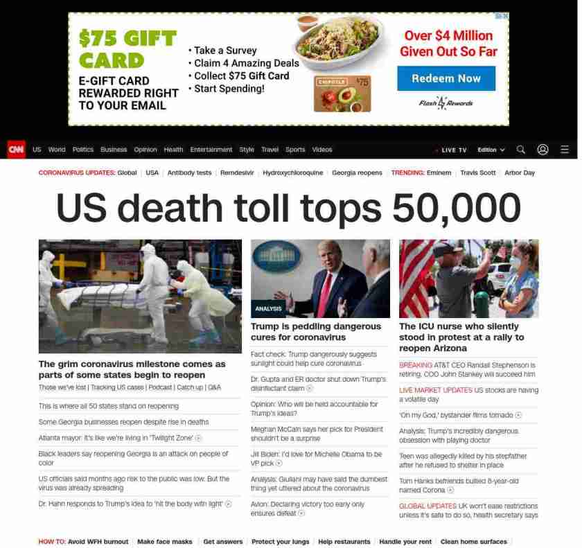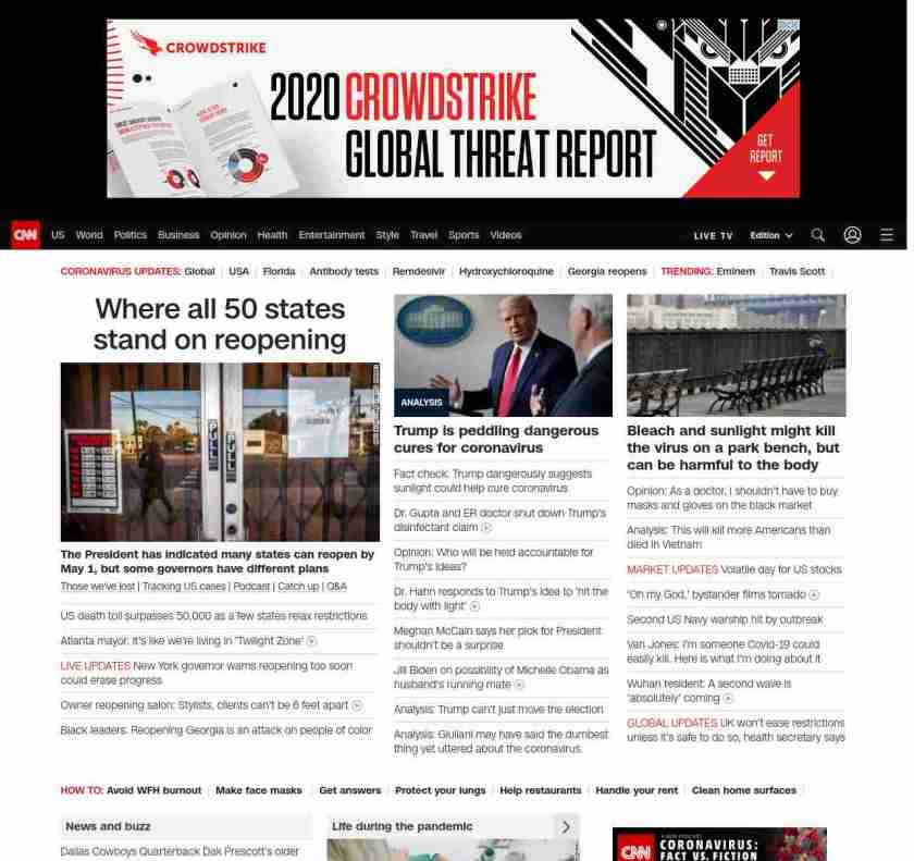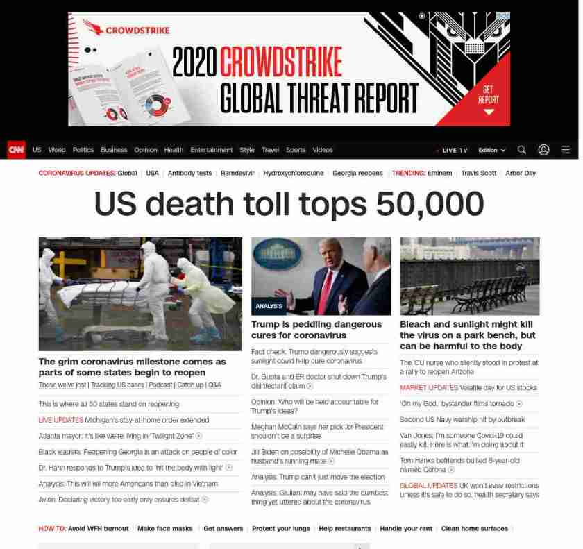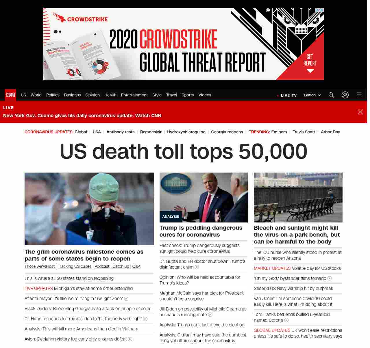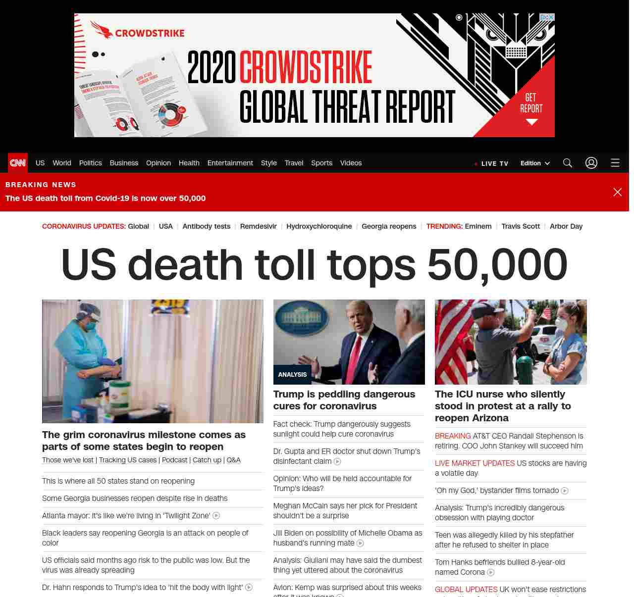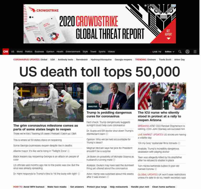|| banner-text–natural”> US death toll tops 50,000 ||” , title: “CNN – Breaking News, Latest News and Videos” , siblings: {“articleList”:[{“uri”:”/2020/04/15/us/states-reopen-coronavirus-trnd/index.html”,”headline”:”u003cstrong>The President has indicated many states can reopen by May 1, but some governors have different plansu003c/strong>”,”thumbnail”:”//cdn.cnn.com/cnnnext/dam/assets/200409205710-02-united-states-recession-small-11.jpg”,”duration”:””,”description”:” u003ca href=”https://www.cnn.com/interactive/2020/health/coronavirus-victims-memories/” target=”_blank”>Those we’ve lost u003c/a>| u003ca href=”https://www.cnn.com/interactive/2020/health/coronavirus-us-maps-and-cases/” target=”_blank”>Tracking US casesu003c/a> | u003ca href=”https://www.cnn.com/audio/podcasts/corona-virus” target=”_blank”>Podcastu003c/a> | u003ca href=”https://www.cnn.com/2020/04/24/world/coronavirus-newsletter-04-24-20-intl/index.html” target=”_blank”>Catch upu003c/a> | u003ca href=”http://cnn.com/CoronavirusAnswers” target=”_blank”>Q&Au003c/a>”,”layout”:””