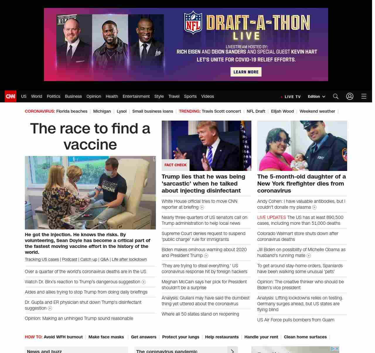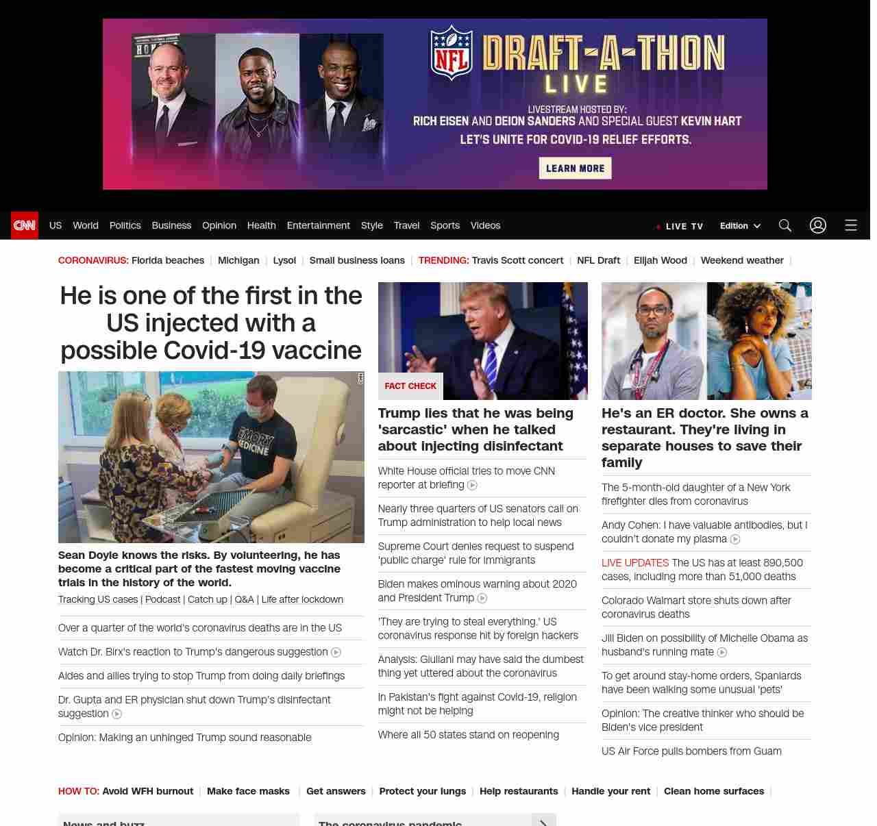 || screaming-banner-text banner-text-size–char-47″ data-analytics=”_list-hierarchical-xs_article_”> He is one of the first in the US injected with a possible Covid-19 vaccine ||” , title: “CNN – Breaking News, Latest News and Videos” , siblings: {“articleList”:[{“uri”:”/2020/04/24/health/coronavirus-vaccine-speed-sanjay-gupta/index.html”,”headline”:”u003cstrong>Sean Doyle knows the risks. By volunteering, he has become a critical part of the fastest moving vaccine trials in the history of the world.u003c/strong>”,”thumbnail”:”//cdn.cnn.com/cnnnext/dam/assets/200424203023-gupta-dnt-vaccine-trial-small-11.jpg”,”duration”:””,”description”:”u003ca href=”https://www.cnn.com/interactive/2020/health/coronavirus-us-maps-and-cases/” target=”_blank”>Tracking US casesu003c/a> | u003ca href=”https://www.cnn.com/audio/podcasts/corona-virus” target=”_blank”>Podcastu003c/a> | u003ca href=”https://www.cnn.com/2020/04/25/world/coronavirus-newsletter-04-25-20-intl/index.html” target=”_blank”>Catch upu003c/a> | u003ca href=”http://cnn.com/CoronavirusAnswers” target=”_blank”>Q&Au003c/a> | u003ca href=”https://www.cnn.com/2020/04/24/world/gallery/coronavirus-after-lockdown/index.html” target=”_blank”>Life after lockdownu003c/a>”,”layout”:””
