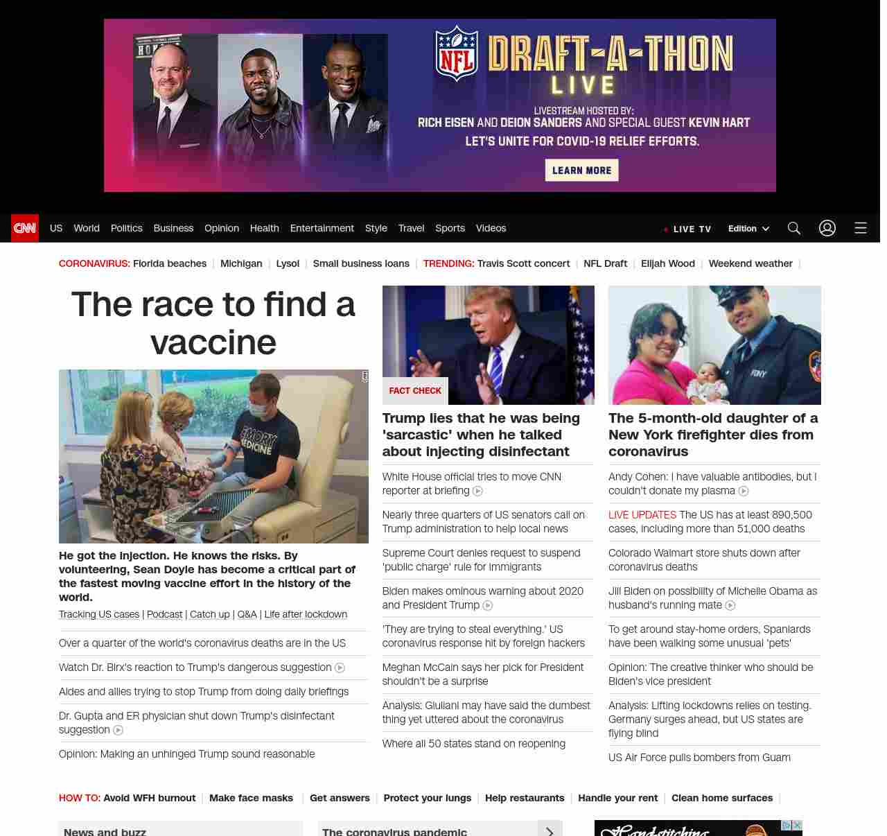 || screaming-banner-text banner-text-size–char-38″ data-analytics=”_list-hierarchical-xs_article_”> The effort to stop Trump’s briefings ||” , title: “CNN – Breaking News, Latest News and Videos” , siblings: {“articleList”:[{“uri”:”/2020/04/24/health/coronavirus-vaccine-speed-sanjay-gupta/index.html”,”headline”:”u003cstrong>He got the injection. He knows the risks. By volunteering, Sean Doyle has become a critical part of the fastest moving vaccine effort in the history of the world.u003c/strong>”,”thumbnail”:”//cdn.cnn.com/cnnnext/dam/assets/200424203023-gupta-dnt-vaccine-trial-small-11.jpg”,”duration”:””,”description”:”u003ca href=”https://www.cnn.com/interactive/2020/health/coronavirus-us-maps-and-cases/” target=”_blank”>Tracking US casesu003c/a> | u003ca href=”https://www.cnn.com/audio/podcasts/corona-virus” target=”_blank”>Podcastu003c/a> | u003ca href=”https://www.cnn.com/2020/04/20/world/coronavirus-newsletter-04-20-20-intl/index.html” target=”_blank”>Catch upu003c/a> | u003ca href=”http://cnn.com/CoronavirusAnswers” target=”_blank”>Q&Au003c/a> | u003ca href=”https://www.cnn.com/2020/04/24/world/gallery/coronavirus-after-lockdown/index.html” target=”_blank”>Life after lockdownu003c/a>”,”layout”:””
