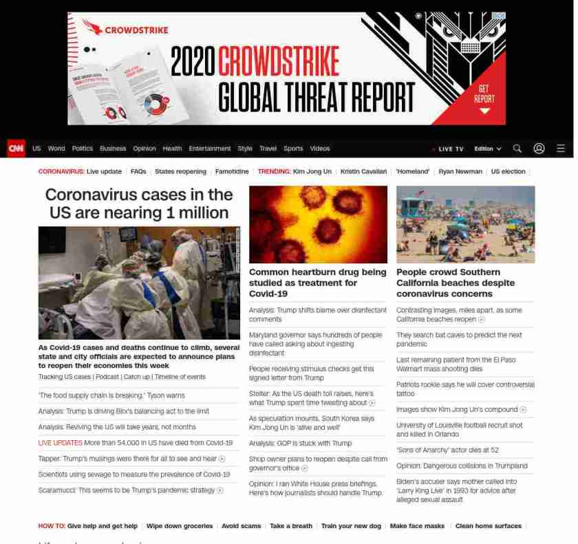 || screaming-banner-text banner-text-size–char-47″ data-analytics=”_list-hierarchical-xs_article_”> Coronavirus cases in the US are nearing 1 million ||” , title: “CNN – Breaking News, Latest News and Videos” , siblings: {“articleList”:[{“uri”:”/2020/04/27/us/coronavirus-reopenings/index.html”,”headline”:”u003cstrong>A number of states started looseningu003c/strong>u003cstrong> restrictions, even as Covid-19 continues to infect and kill peopleu003c/strong>”,”thumbnail”:”//cdn.cnn.com/cnnnext/dam/assets/200425135328-01-coronavirus-reopen-oklahoma-0424-small-11.jpg”,”duration”:””,”description”:”u003ca href=”https://www.cnn.com/interactive/2020/health/coronavirus-us-maps-and-cases/” target=”_blank”>Tracking US casesu003c/a> | u003ca href=”https://www.cnn.com/audio/podcasts/corona-virus” target=”_blank”>Podcastu003c/a> |u003ca href=”https://www.cnn.com/2020/04/26/world/coronavirus-newsletter-04-26-20-intl/index.html” target=”_blank”> Catch upu003c/a> | u003ca href=”https://www.cnn.com/interactive/2020/health/covid19-pandemic-video-timeline/index.html” target=”_blank”>Timeline of eventsu003c/a> “,”layout”:””