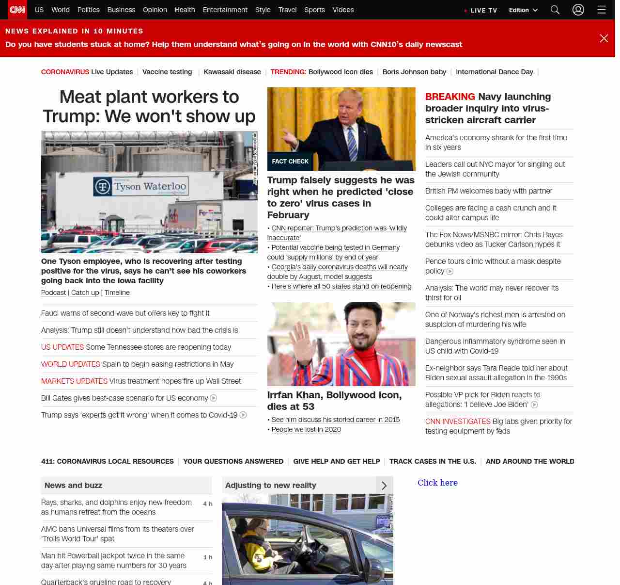 || screaming-banner-text banner-text-size–char-47″ data-analytics=”_list-hierarchical-xs_article_”> Fauci warns of second wave but offers key to fight it ||” , title: “CNN – Breaking News, Latest News and Videos” , siblings: {“articleList”:[{“uri”:”/2020/04/29/business/meat-processing-plant-workers-reaction-executive-order/index.html”,”headline”:”u003cstrong>One Tyson employee, who is recovering after testing positive for the virus, says he can’t see his coworkers going back into the Iowa facility u003c/strong>”,”thumbnail”:”//cdn.cnn.com/cnnnext/dam/assets/200422145525-tyson-waterloo-iowa-file-small-11.jpg”,”duration”:””,”description”:”u003ca href=”https://www.cnn.com/audio/podcasts/corona-virus” target=”_blank”>Podcastu003c/a> |u003ca href=”https://www.cnn.com/2020/04/28/world/coronavirus-newsletter-04-28-20-intl/index.html” target=”_blank”> Catch upu003c/a> | u003ca href=”https://www.cnn.com/interactive/2020/health/covid19-pandemic-video-timeline/index.html” target=”_blank”>Timelineu003c/a>”,”layout”:””