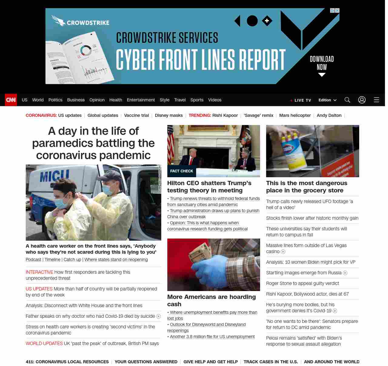 || screaming-banner-text banner-text-size–char-47″ data-analytics=”_list-hierarchical-xs_article_”> A day in the life of paramedics battling the coronavirus pandemic ||” , title: “CNN – Breaking News, Latest News and Videos” , siblings: {“articleList”:[{“uri”:”/2020/04/30/us/paterson-pandemic-paramedics/index.html”,”headline”:”u003cstrong>A health care worker on the front lines says, ‘Anybody who says they’re not scared during this is lying to you’u003c/strong>”,”thumbnail”:”//cdn.cnn.com/cnnnext/dam/assets/200428165630-paterson-suiting-up-small-11.jpg”,”duration”:””,”description”:”u003ca href=”https://www.cnn.com/audio/podcasts/corona-virus” target=”_blank”>Podcastu003c/a> | u003ca href=”https://www.cnn.com/interactive/2020/health/covid19-pandemic-video-timeline/index.html” target=”_blank”>Timelineu003c/a> | u003ca href=”https://www.cnn.com/2020/04/30/world/coronavirus-newsletter-04-30-20-intl/index.html” target=”_blank”>Catch upu003c/a> | u003ca href=”https://www.cnn.com/interactive/2020/us/states-reopen-coronavirus-trnd/” target=”_blank”>Where states stand on reopeningu003c/a>”,”layout”:””