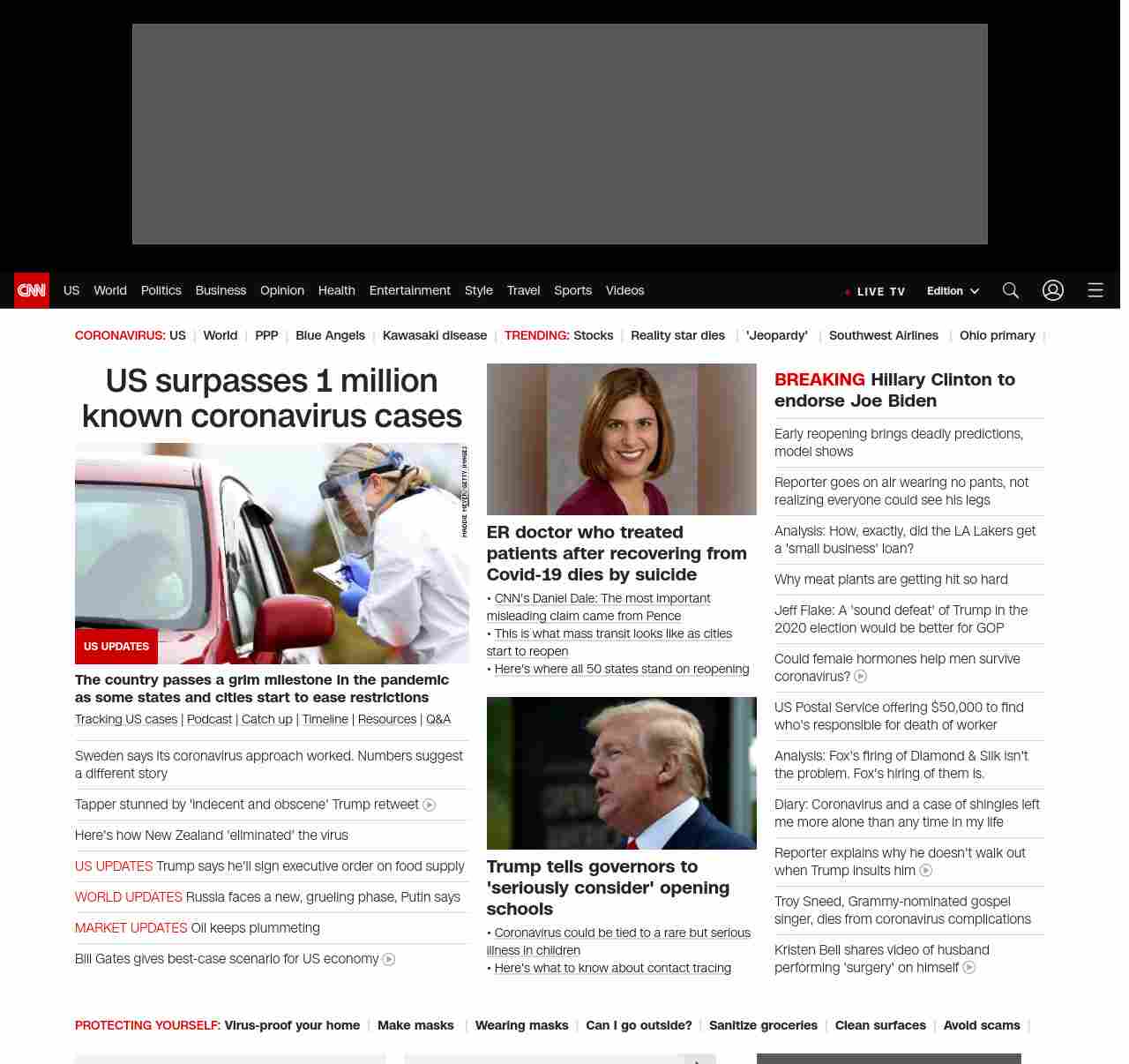 || screaming-banner-text banner-text-size–char-47″ data-analytics=”_list-hierarchical-xs_article_”> US surpasses 1 million known coronavirus cases ||” , title: “CNN – Breaking News, Latest News and Videos” , siblings: {“articleList”:[{“uri”:”/us/live-news/us-coronavirus-update-04-28-20/index.html”,”headline”:”u003cstrong>The country passes a grim milestone in the pandemic as some states and cities start to ease restrictionsu003c/strong>”,”thumbnail”:”//cdn.cnn.com/cnnnext/dam/assets/200428134956-coronavirus-testing-0428-small-11.jpg”,”duration”:””,”description”:”u003ca href=”https://www.cnn.com/interactive/2020/health/coronavirus-us-maps-and-cases/” target=”_blank”>Tracking US casesu003c/a> | u003ca href=”https://www.cnn.com/audio/podcasts/corona-virus” target=”_blank”>Podcastu003c/a> |u003ca href=”https://www.cnn.com/2020/04/28/world/coronavirus-newsletter-04-28-20-intl/index.html” target=”_blank”> Catch upu003c/a> | u003ca href=”https://www.cnn.com/interactive/2020/health/covid19-pandemic-video-timeline/index.html” target=”_blank”>Timelineu003c/a> | u003ca href=”https://www.cnn.com/resources/coronavirus-information” target=”_blank”>Resourcesu003c/a> | u003ca href=”http://cnn.com/coronavirusanswers” target=”_blank”>Q&Au003c/a>”,”layout”:””