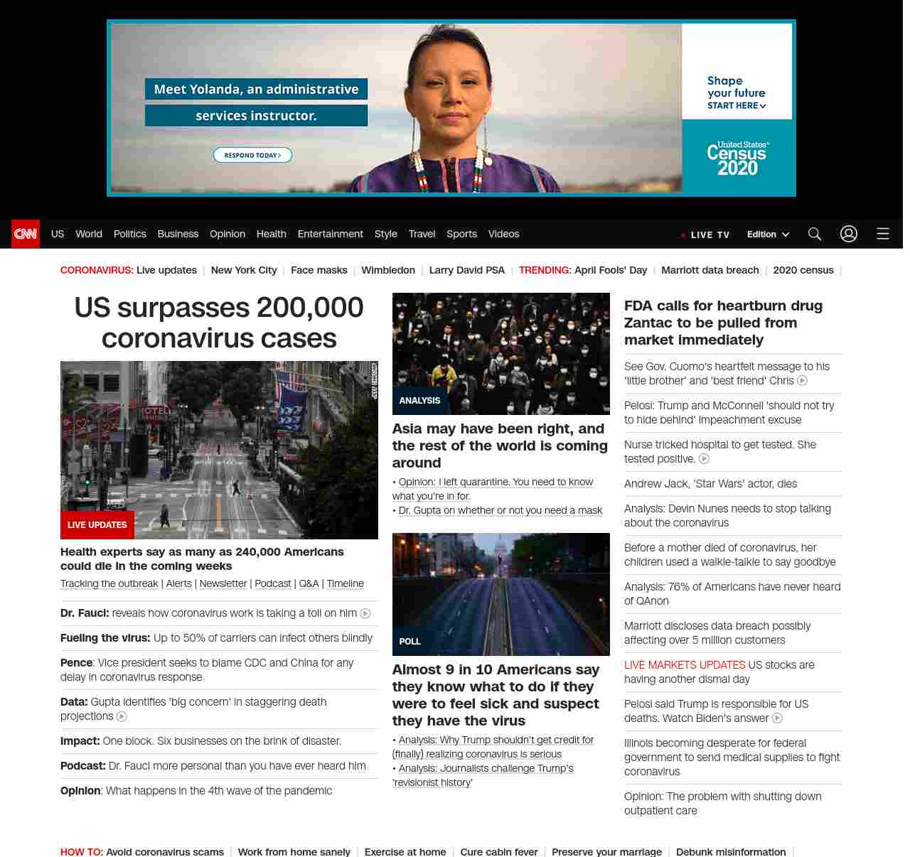 || screaming-banner-text banner-text-size–char-41″ data-analytics=”_list-hierarchical-xs_hyperlink_”> US surpasses 200,000 coronavirus cases ||” , title: “CNN – Breaking News, Latest News and Videos” , siblings: {“articleList”:[{“uri”:”/videos/health/2020/04/01/anthony-fauci-health-coronavirus-pandemic-cooper-vpx.cnn”,”headline”:”u003cstrong>Dr. Fauci:u003c/strong> reveals how coronavirus work is taking a toll on him”,”thumbnail”:”//cdn.cnn.com/cnnnext/dam/assets/200331124419-02-fauci-0327-small-11.jpg”,”duration”:”01:22″,”description”:”Dr. Anthony Fauci opens up to Dr. u003ca href=”/profiles/sanjay-gupta-profile” target=”_blank”>Sanjay Guptau003c/a> on CNN’s podcast about how he’s coping with his personal health while juggling daily demands. “,”layout”:””,”iconType”:”video”