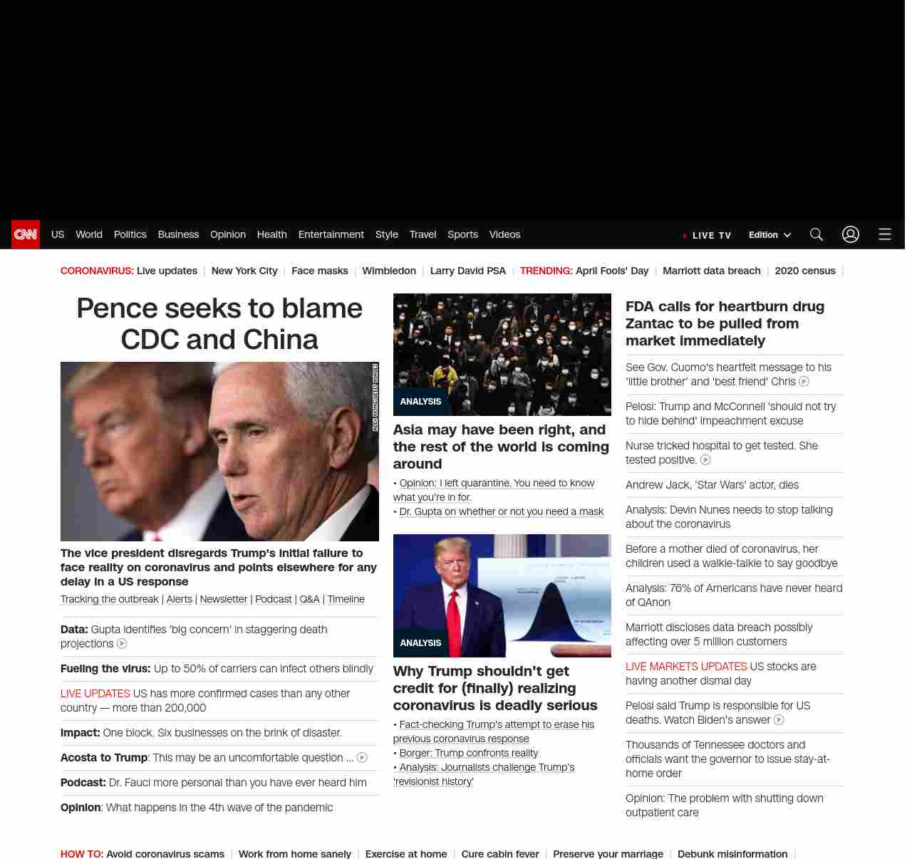 || screaming-banner-text banner-text-size–char-35″ data-analytics=”_list-hierarchical-xs_article_”> Pence seeks to blame CDC and China ||” , title: “CNN – Breaking News, Latest News and Videos” , siblings: {“articleList”:[{“uri”:”/2020/04/01/health/us-coronavirus-updates-wednesday/index.html”,”headline”:”u003cstrong>Fueling the virus: u003c/strong>Upu003cstrong> u003c/strong>to 50% of carriers can infect others blindly”,”thumbnail”:”//cdn.cnn.com/cnnnext/dam/assets/200401031130-coronavirus-new-york-0330-small-11.jpg”,”duration”:””,”description”:””,”layout”:””