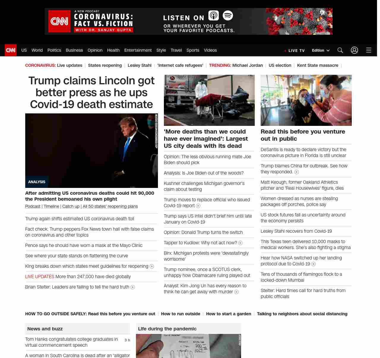 || screaming-banner-text banner-text-size–char-47″ data-analytics=”_list-hierarchical-xs_article_”> Trump claims Lincoln got better press as he ups Covid-19 death estimate ||” , title: “CNN – Breaking News, Latest News and Videos” , siblings: {“articleList”:[{“uri”:”/2020/05/04/politics/trump-lincoln-press-treatment-deaths/index.html”,”headline”:”After admitting US coronavirus deaths could hit 90,000, the President bemoaned his own plight “,”thumbnail”:”//cdn.cnn.com/cnnnext/dam/assets/200504004700-03-trump-fox-town-hall-small-11.jpg”,”duration”:””,”description”:”u003ca href=”https://www.cnn.com/audio/podcasts/corona-virus” target=”_blank”>Podcastu003c/a> | u003ca href=”https://www.cnn.com/interactive/2020/health/covid19-pandemic-video-timeline/index.html” target=”_blank”>Timelineu003c/a> | u003ca href=”http://www.cnn.com/2020/05/03/world/coronavirus-newsletter-05-03-20/index.html” target=”_blank”>Catch upu003c/a> | u003ca href=”https://www.cnn.com/interactive/2020/us/states-reopen-coronavirus-trnd/” target=”_blank”>All 50 states’ reopening plansu003c/a>”,”layout”:””